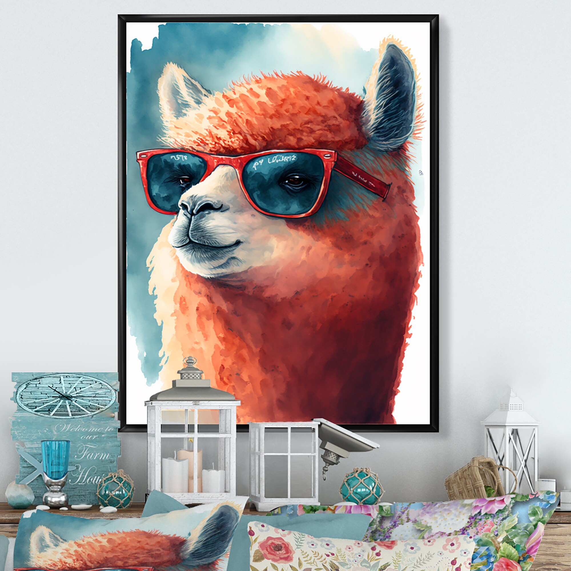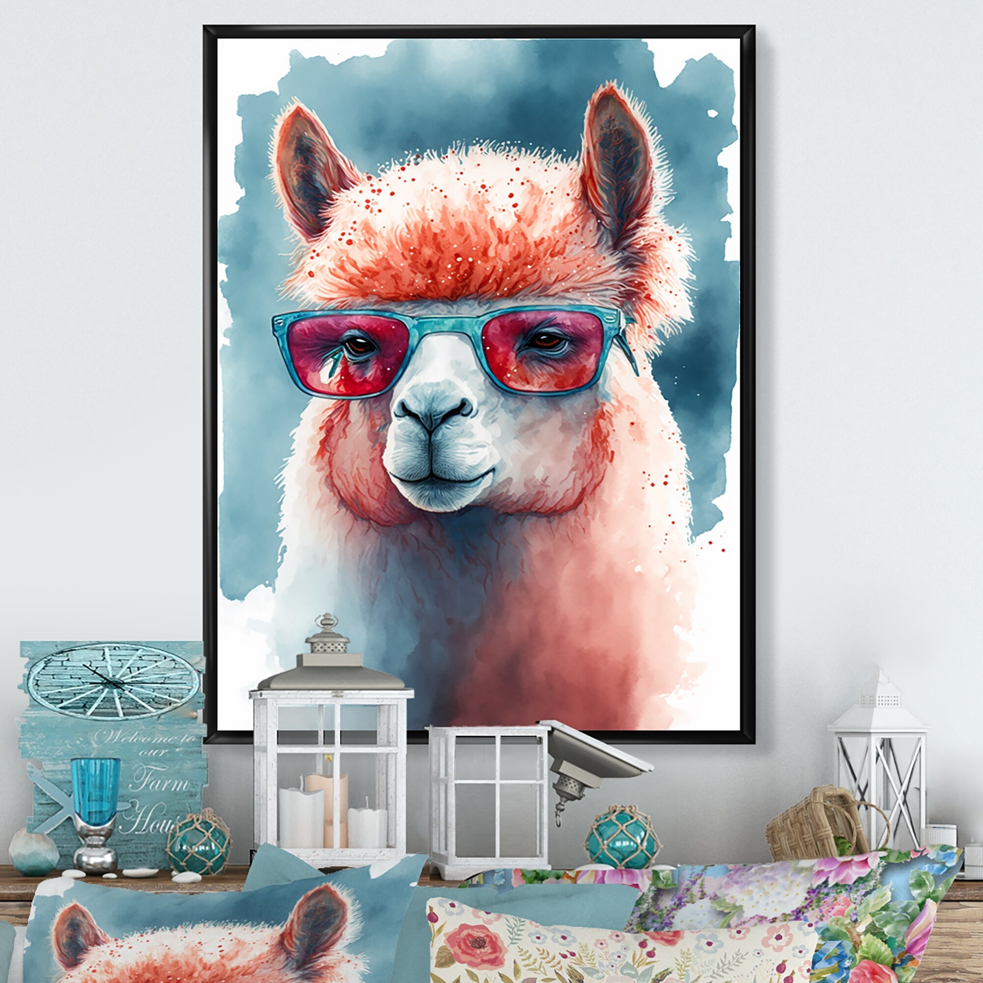 Designart "Cool Llama With Sunglasses Watercolour IV" Animals Llama Framed Canvas Wall Art Print