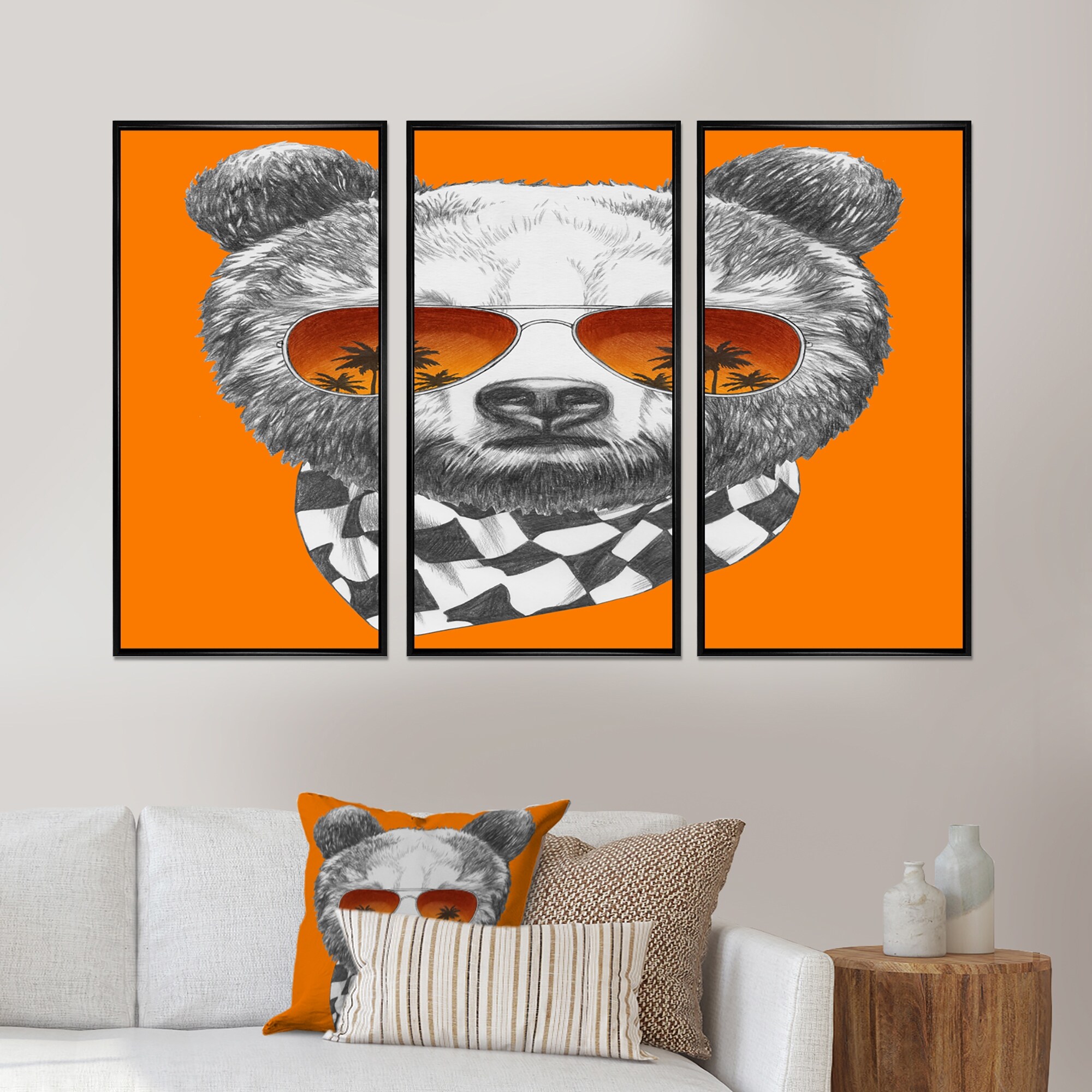 Designart "Funny Bear with Sunglasses" Animal Framed Canvas Wall Art Set of 3 - 4 Colors of Frames
