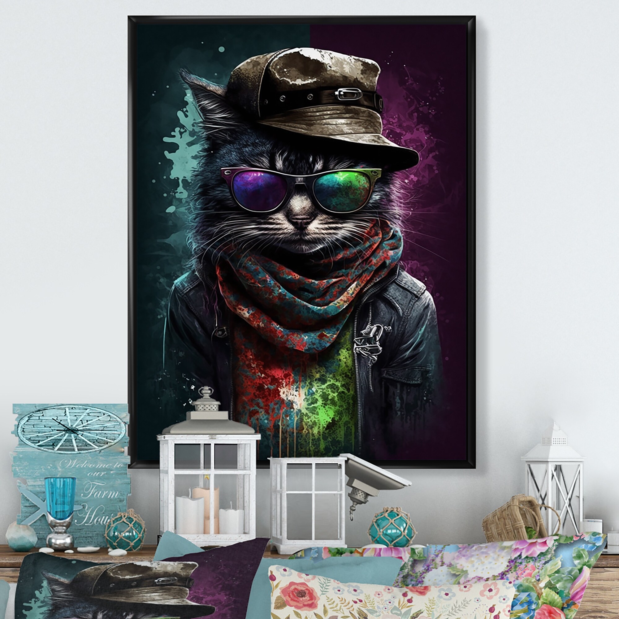 Designart "Cool Cat With Funky Sunglasses And A Hat II" Animals Cat Framed Canvas Wall Art Print