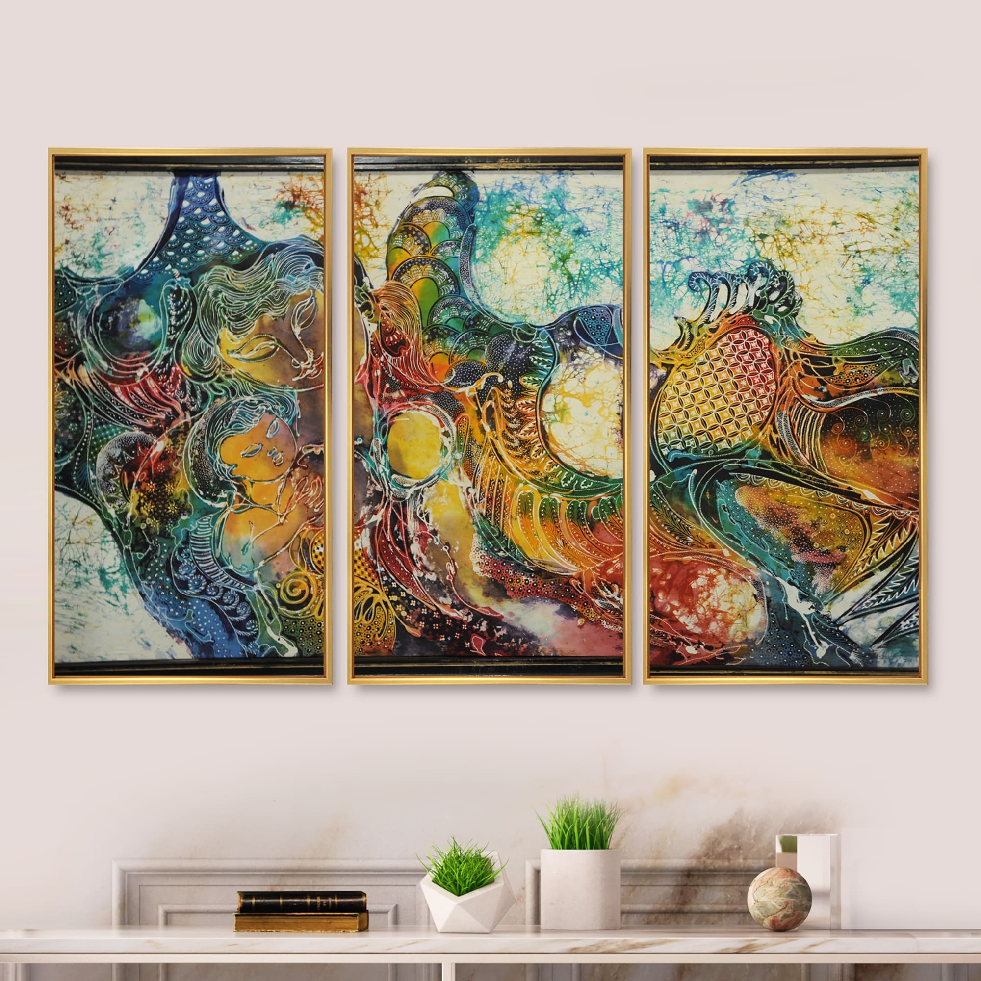 Designart "Mother With Child in Batik" Modern Framed Canvas Wall Art Print Set of 3 - 4 Colors of Frames