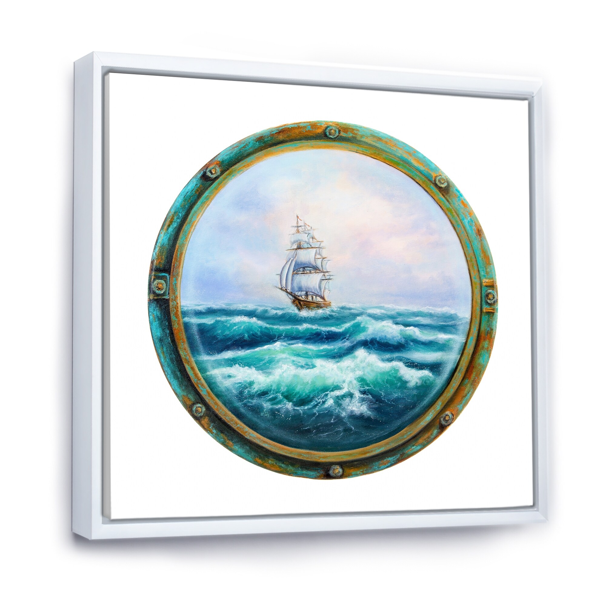 Designart "Cabin Window Showing Ship in Stormy Ocean" Nautical & Coastal Framed Canvas Wall Art Print
