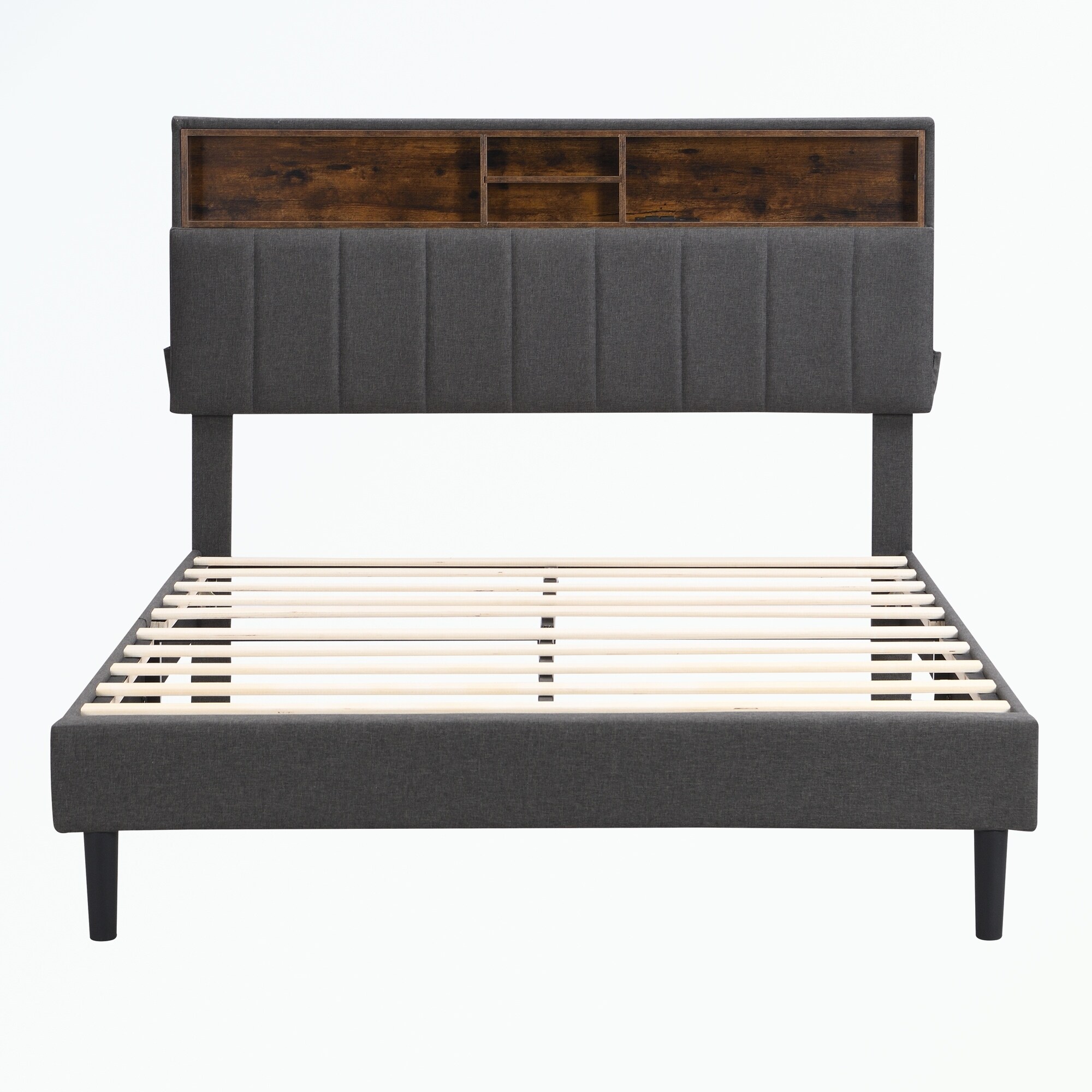 Queen Size Upholstered Platform Bed with Storage Headboard and USB Port,  Linen Fabric Upholstered Bed