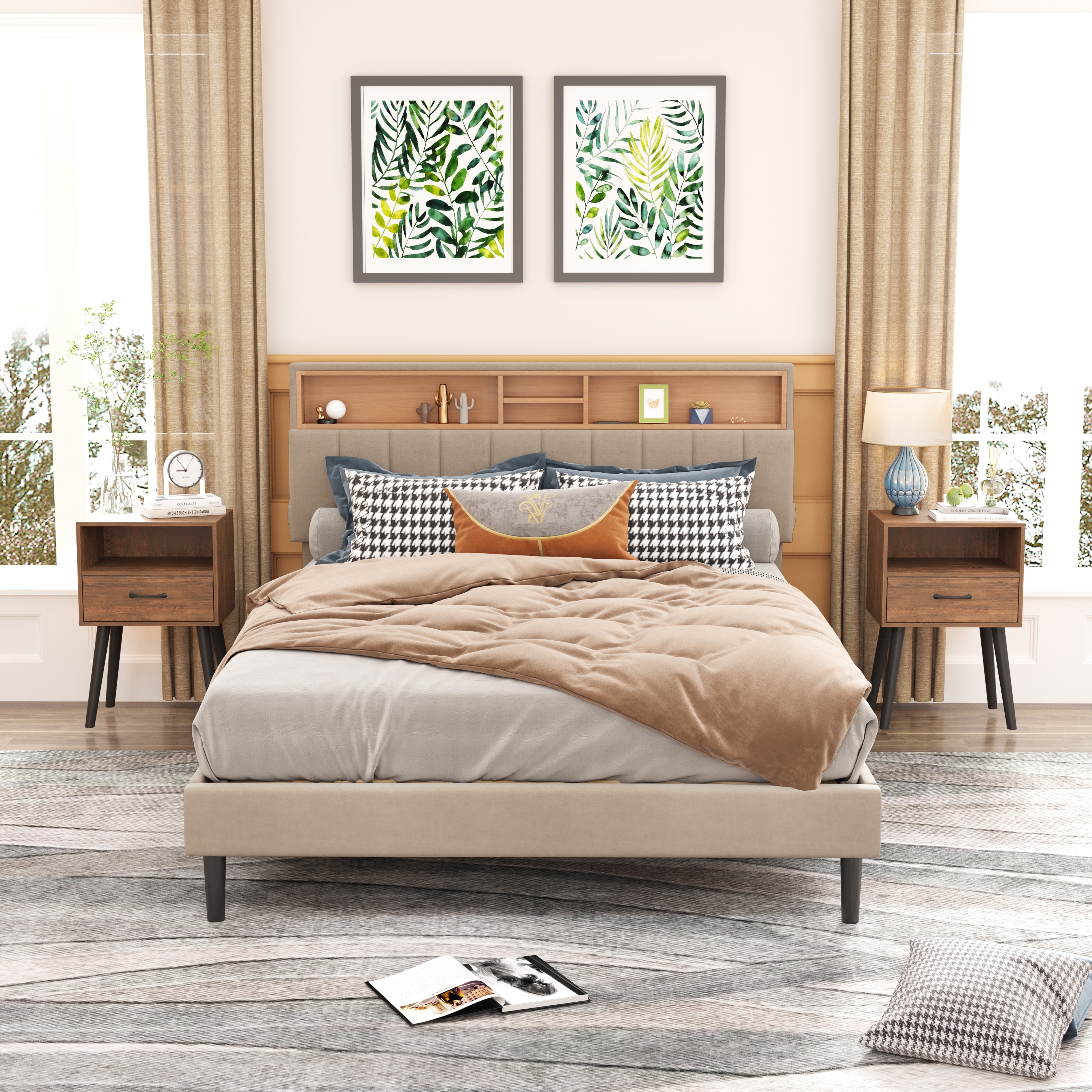 Queen Size Upholstered Platform Bed with Storage Headboard and USB Port, Linen Fabric Upholstered Bed ,Beige