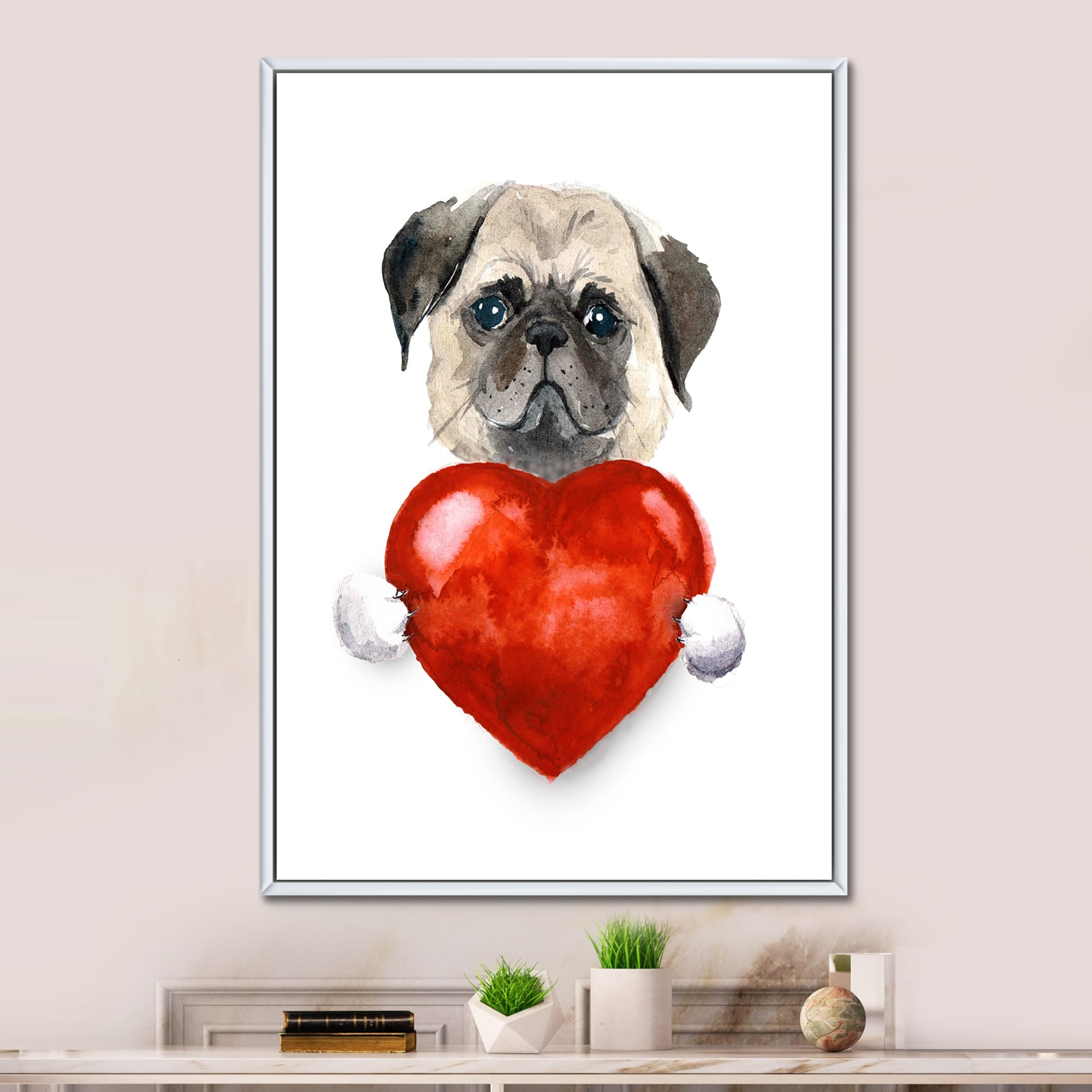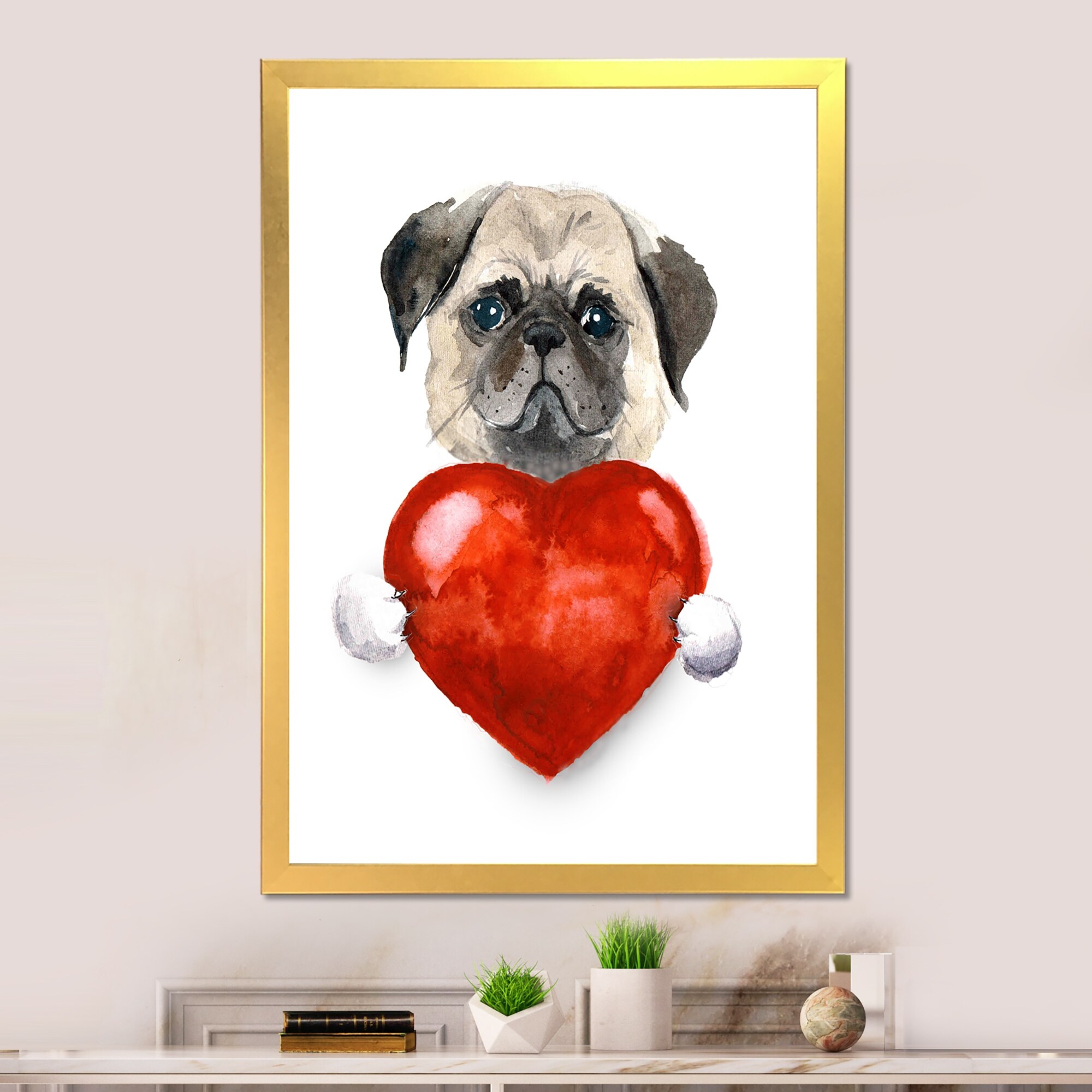 Designart "Little Dog Holding Valentine Heart" Children's Art Framed Wall Decor