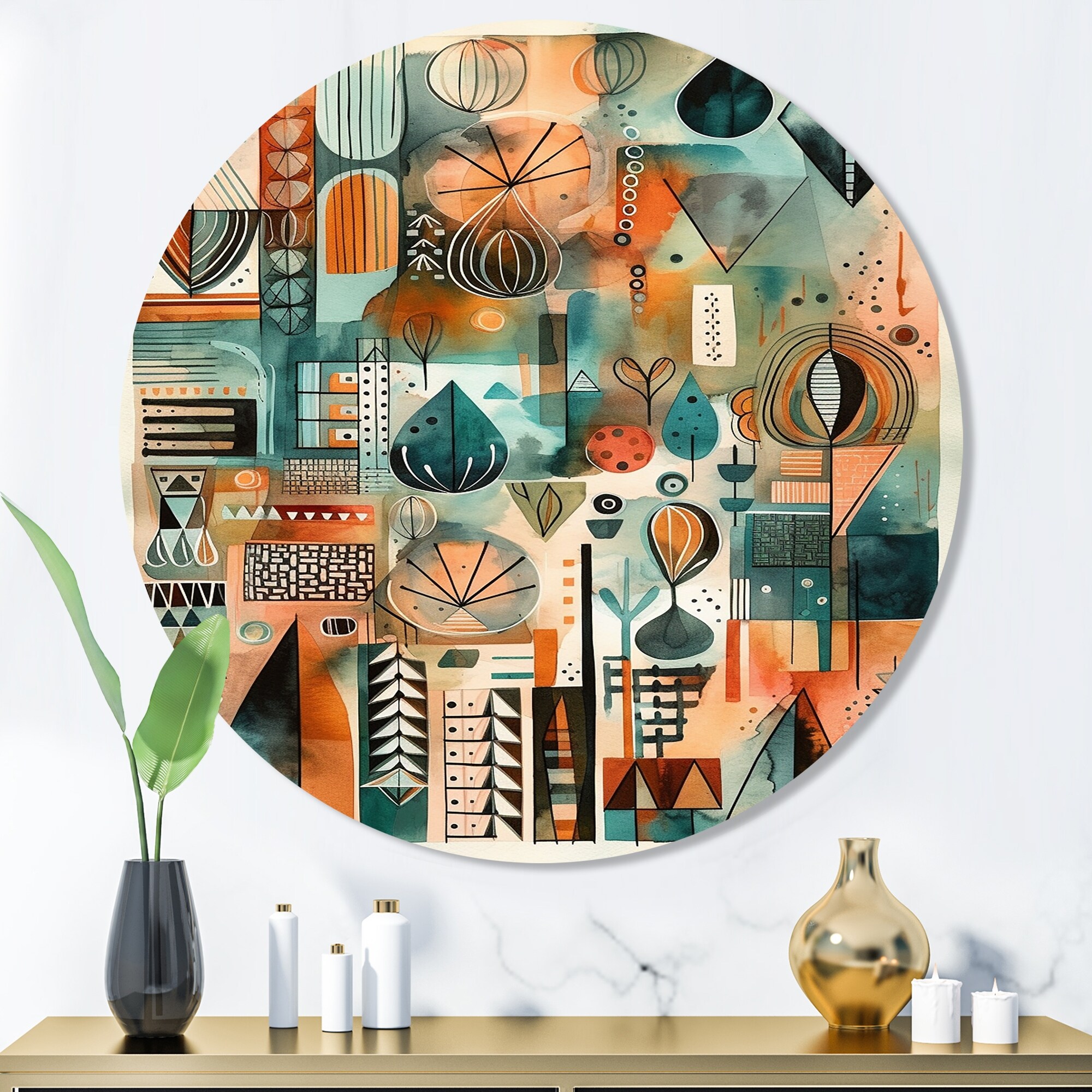 Designart "Green And Orange Abstracted Vistas" Abstract Landscape Metal Round Wall Art