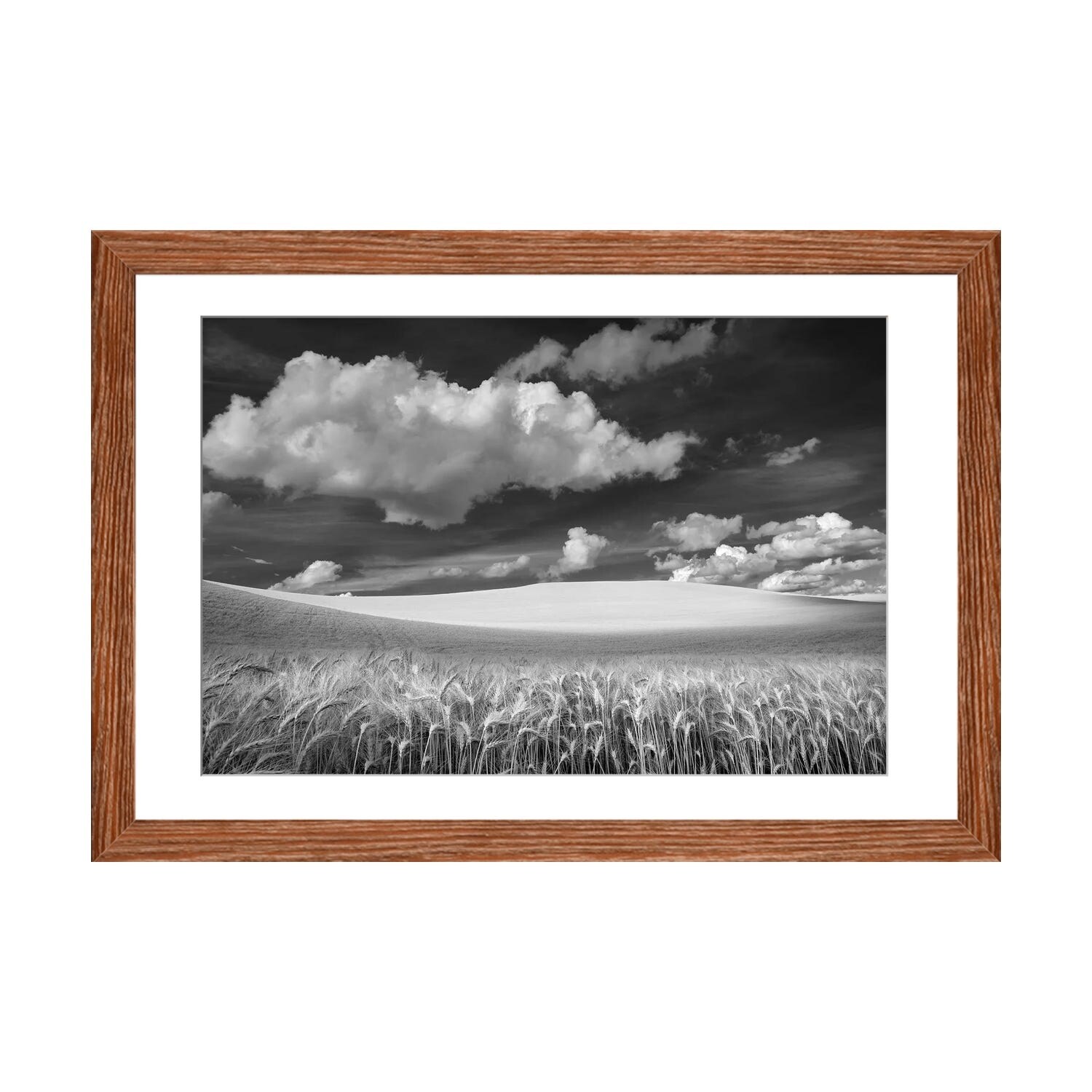 "Landscape of wheat field with clouds in sky" Black Framed Print