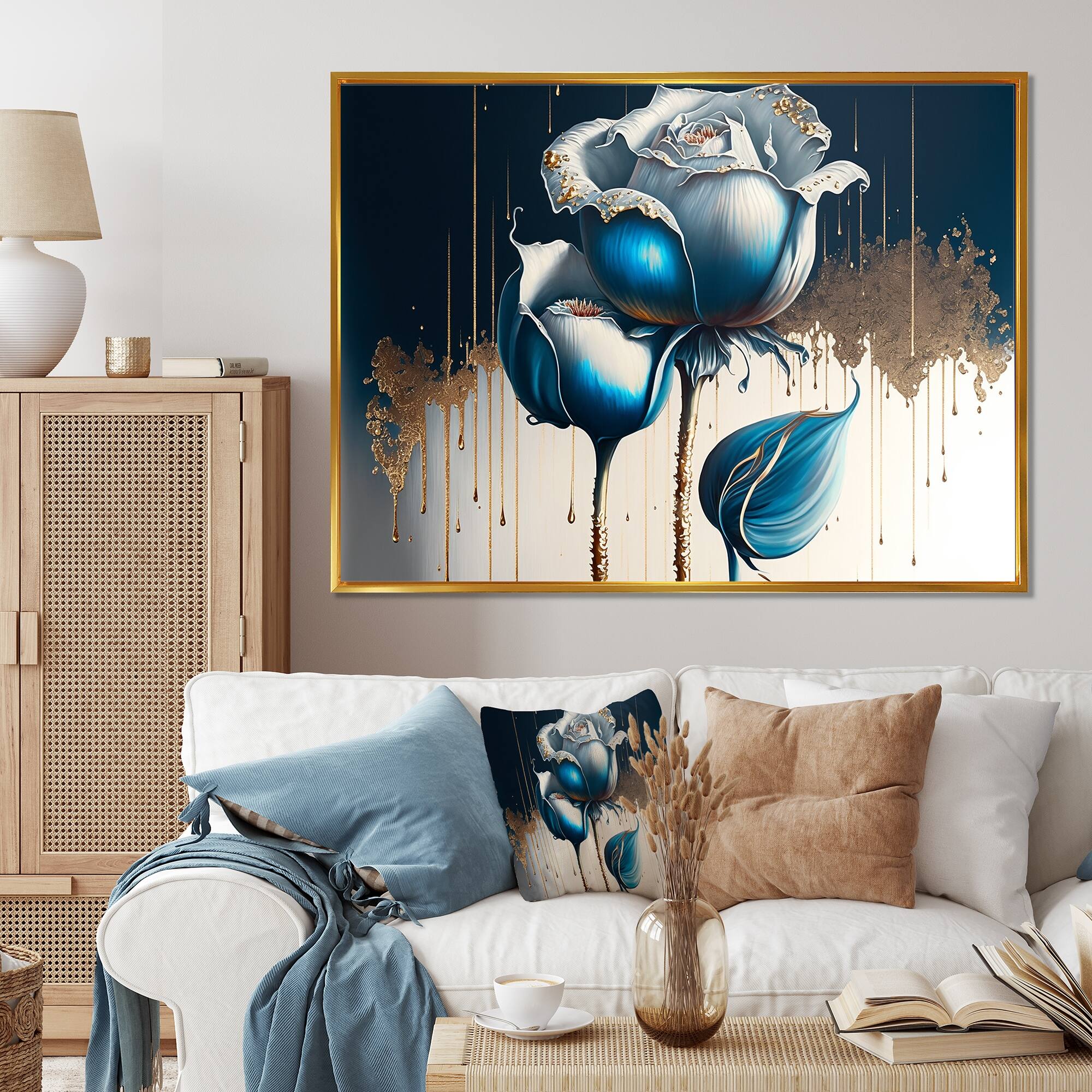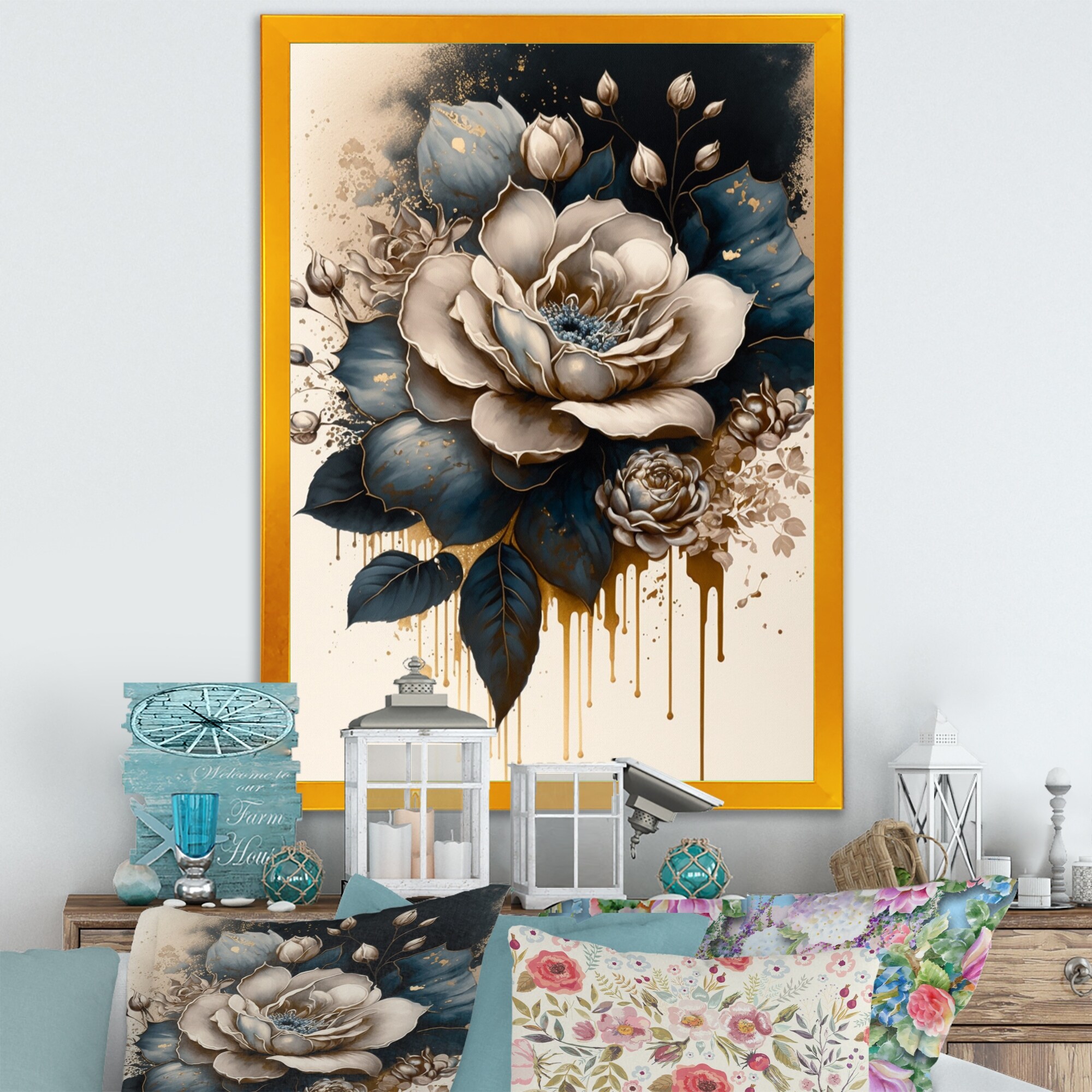 Designart "Golden White Floral Arrangement in Vase I" Floral Framed Canvas Prints