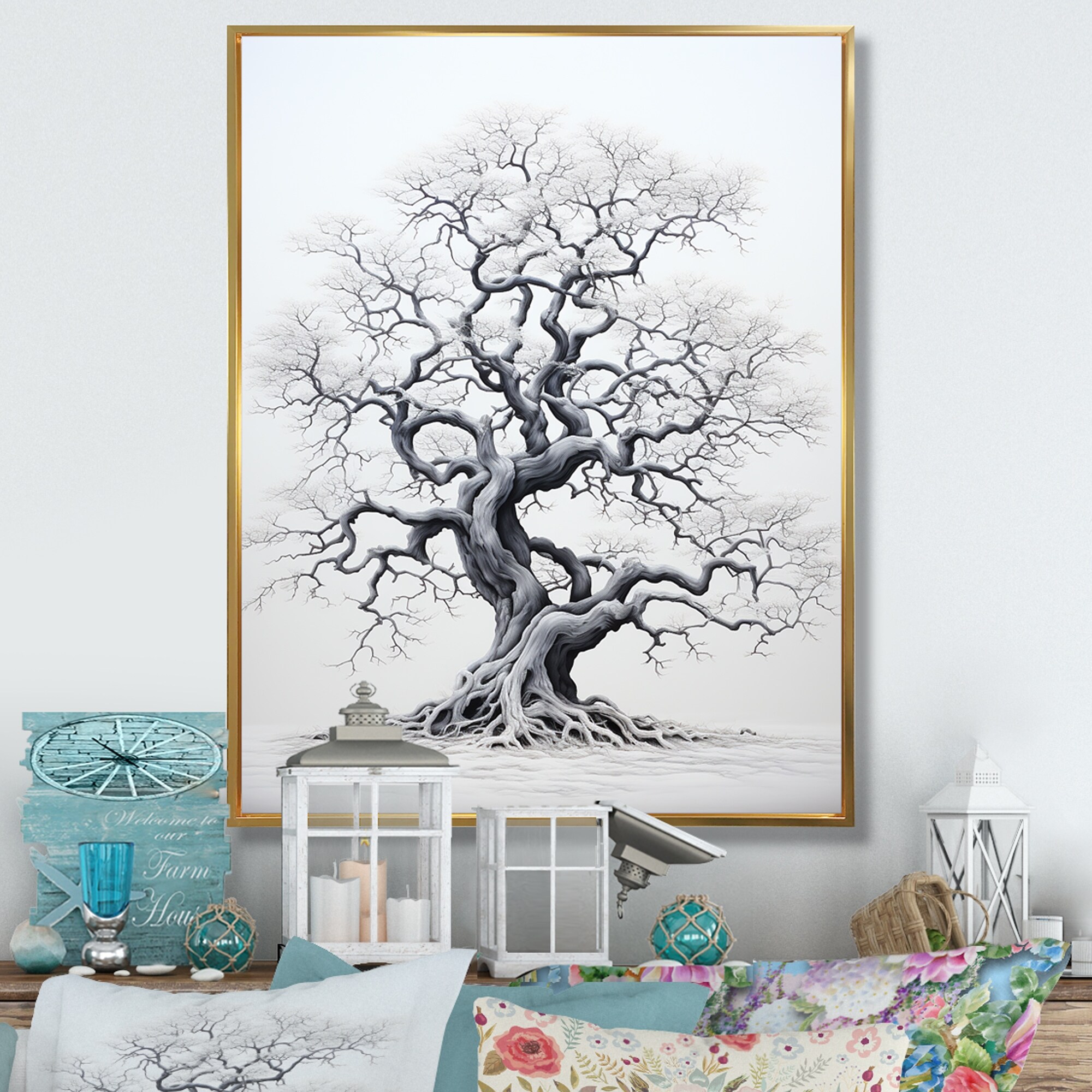Designart "White Tree Harmony Landscape II" Tree Monochrome Framed Canvas Print