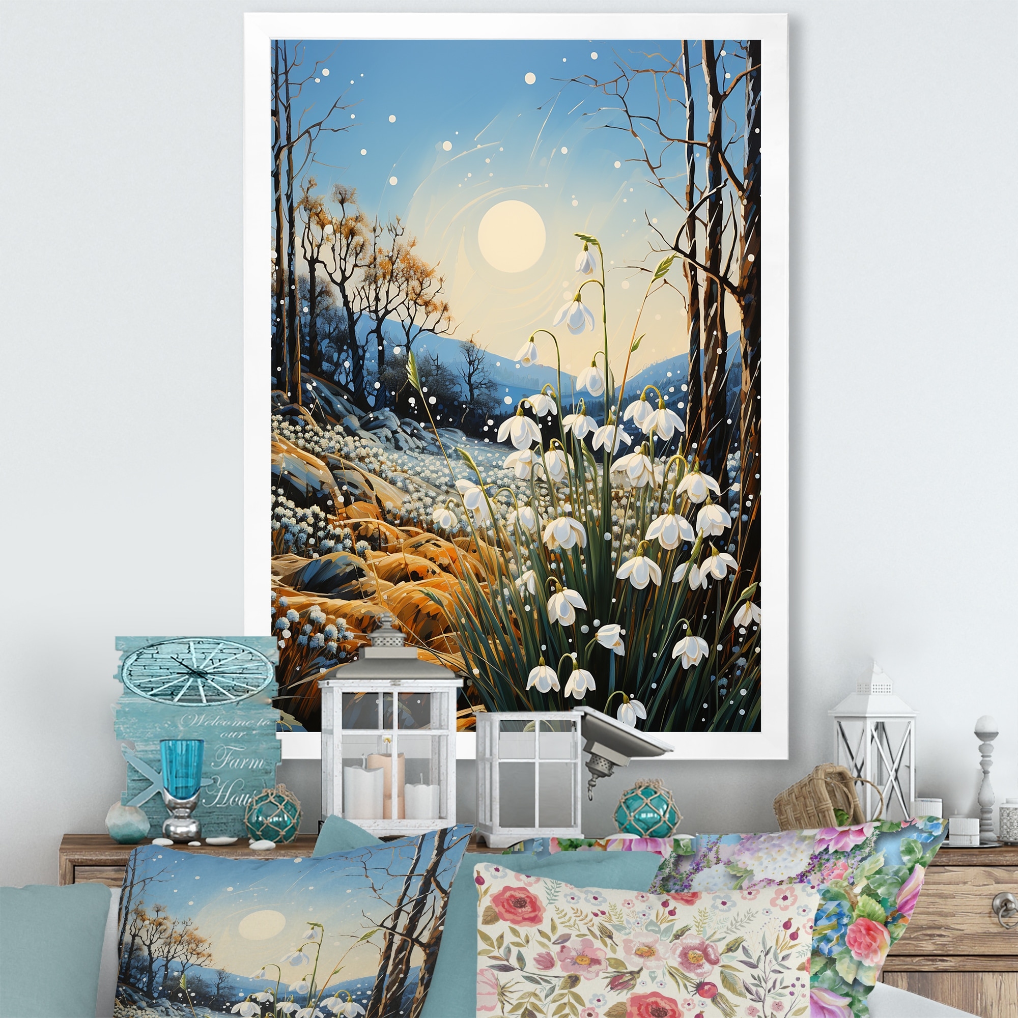 Designart "White Snowdrops Field Pointillism I" Snowdrops Framed Canvas Prints