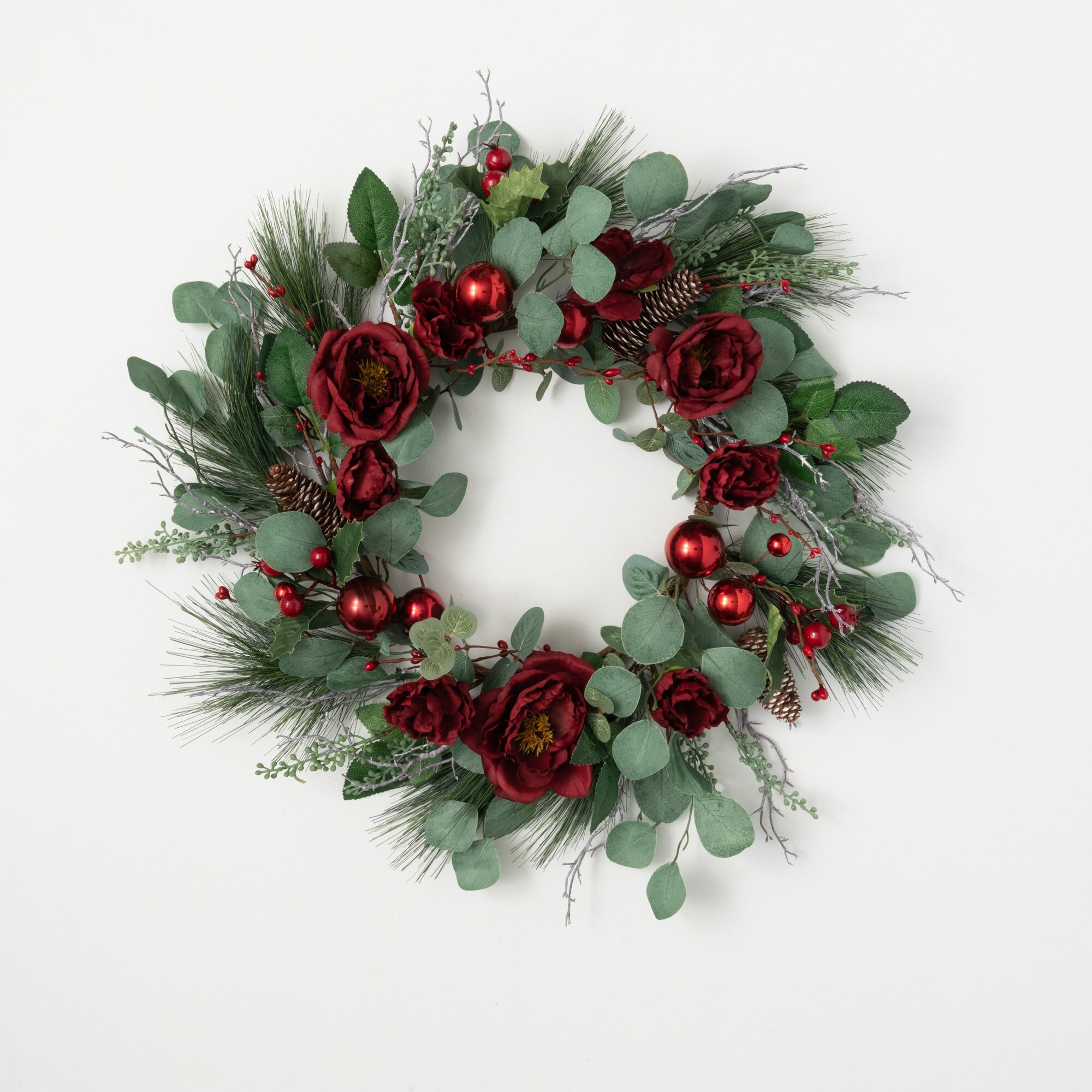 Poinsettias, Berries, and Pinecones Artificial Christmas Wreath, 24-Inch, Unlit - Red