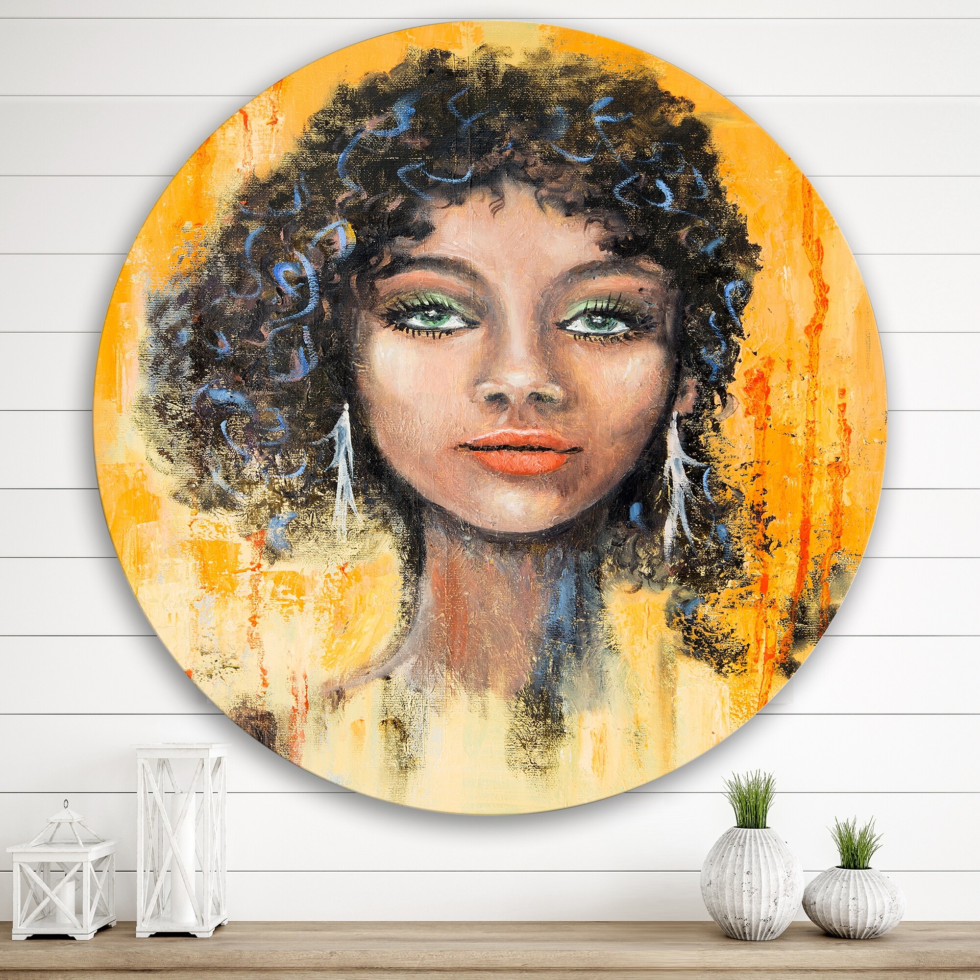 Designart 'Woman Face With Green Eyes & Black Hair Impression' Modern Metal Circle Wall Art