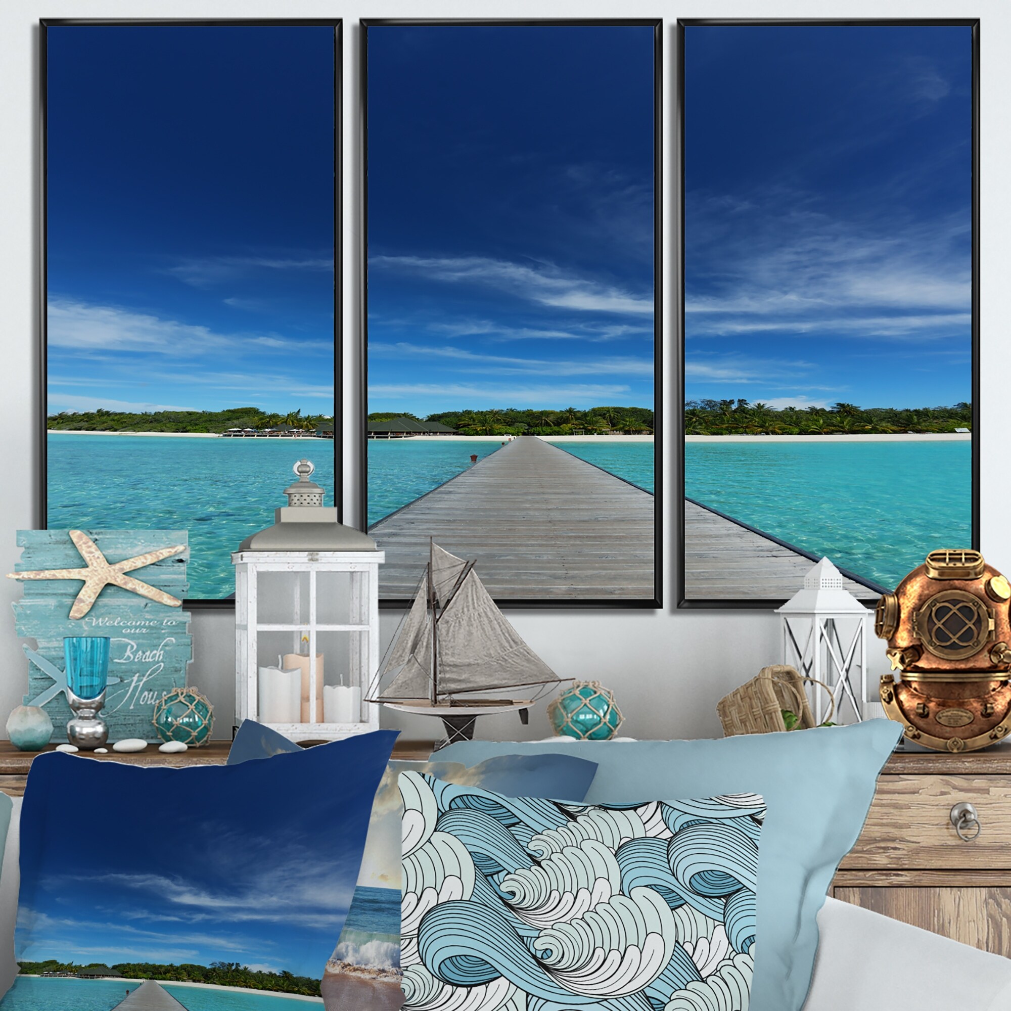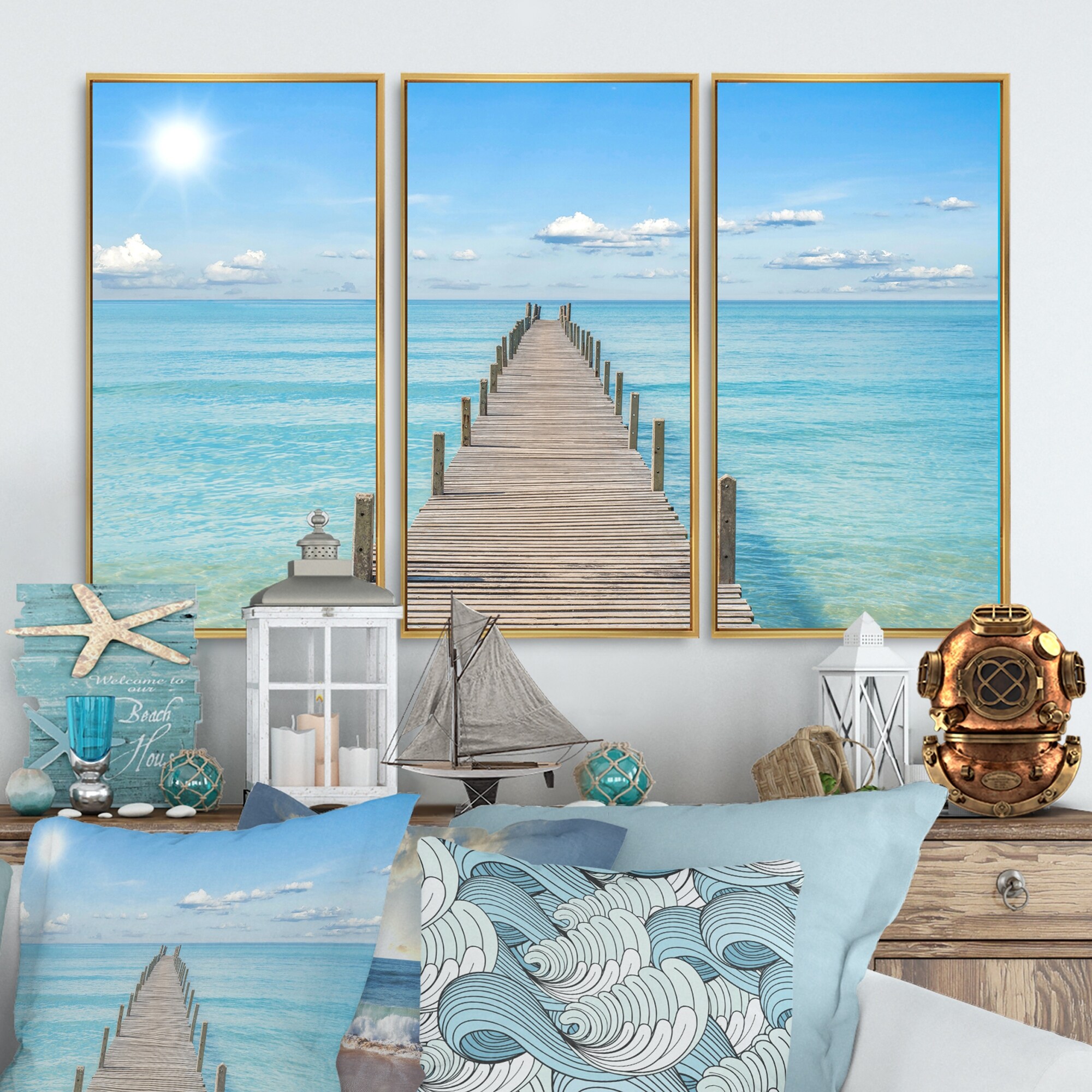 Designart "Infinite Sea Pier" Sea & Shore Framed Canvas Wall Art Print Set of 3 - 4 Colors of Frames