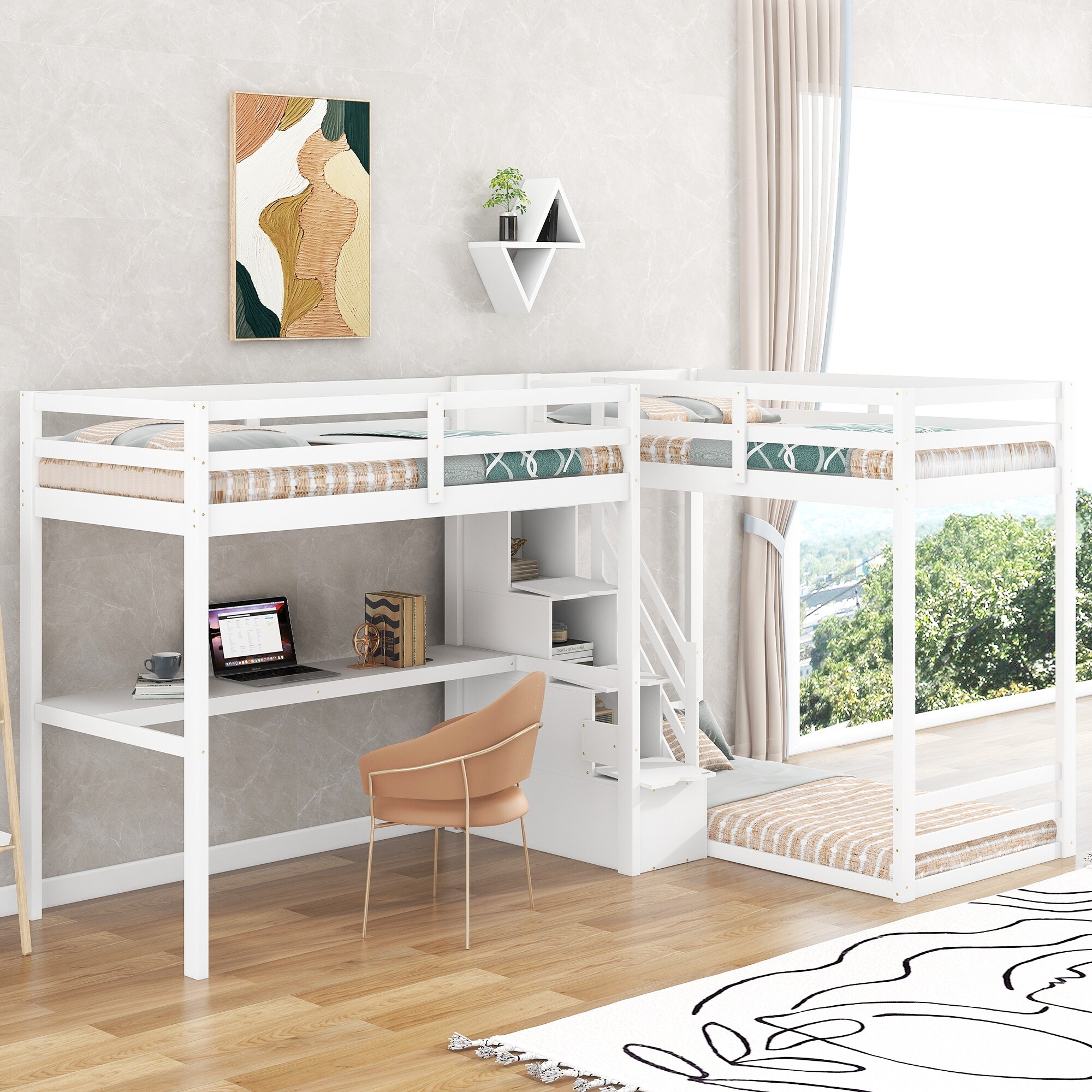 Twin Size L-Shaped Bunk Bed & Loft Bed with Built-in Middle Staircase, 3-in-1 Convertible Wood Bedframe w/ Desk&Storage Case