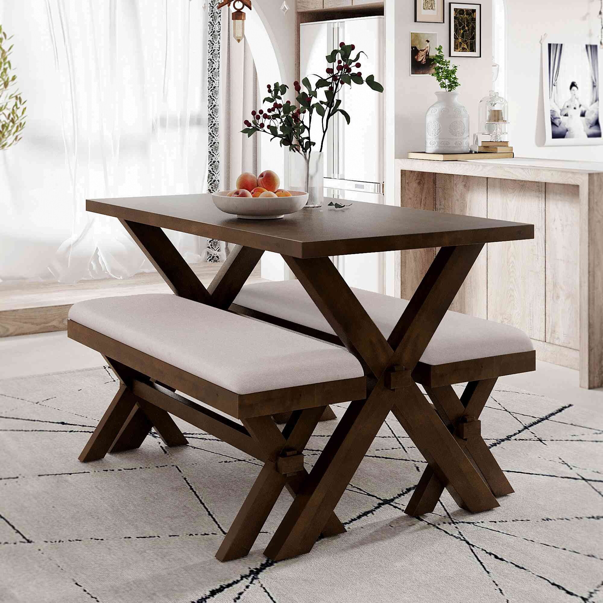 Brown 3-Piece Farmhouse Rustic Wood Dining Set with Upholstered Benches, Modern X Design