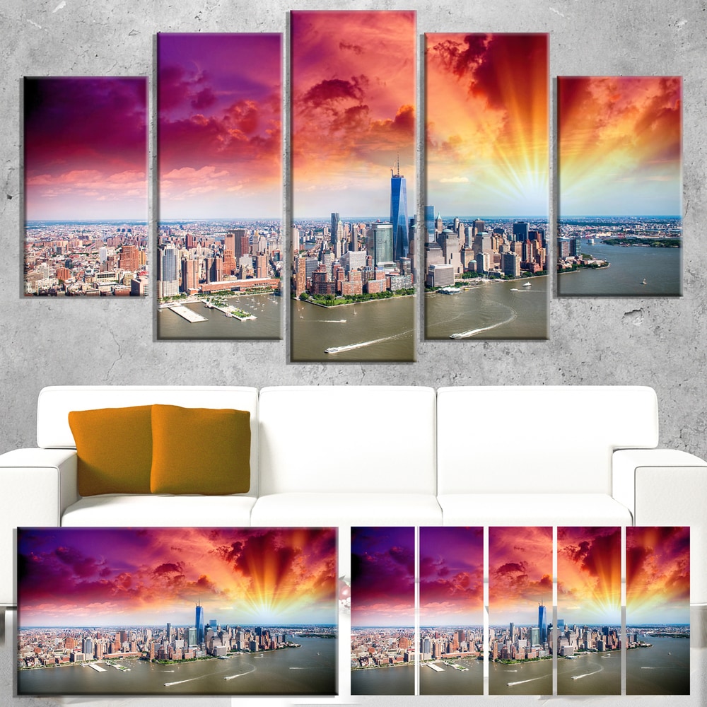Designart "Colorful New York Skyline Aerial View" Modern Cityscape Canvas Artwork Print - Purple
