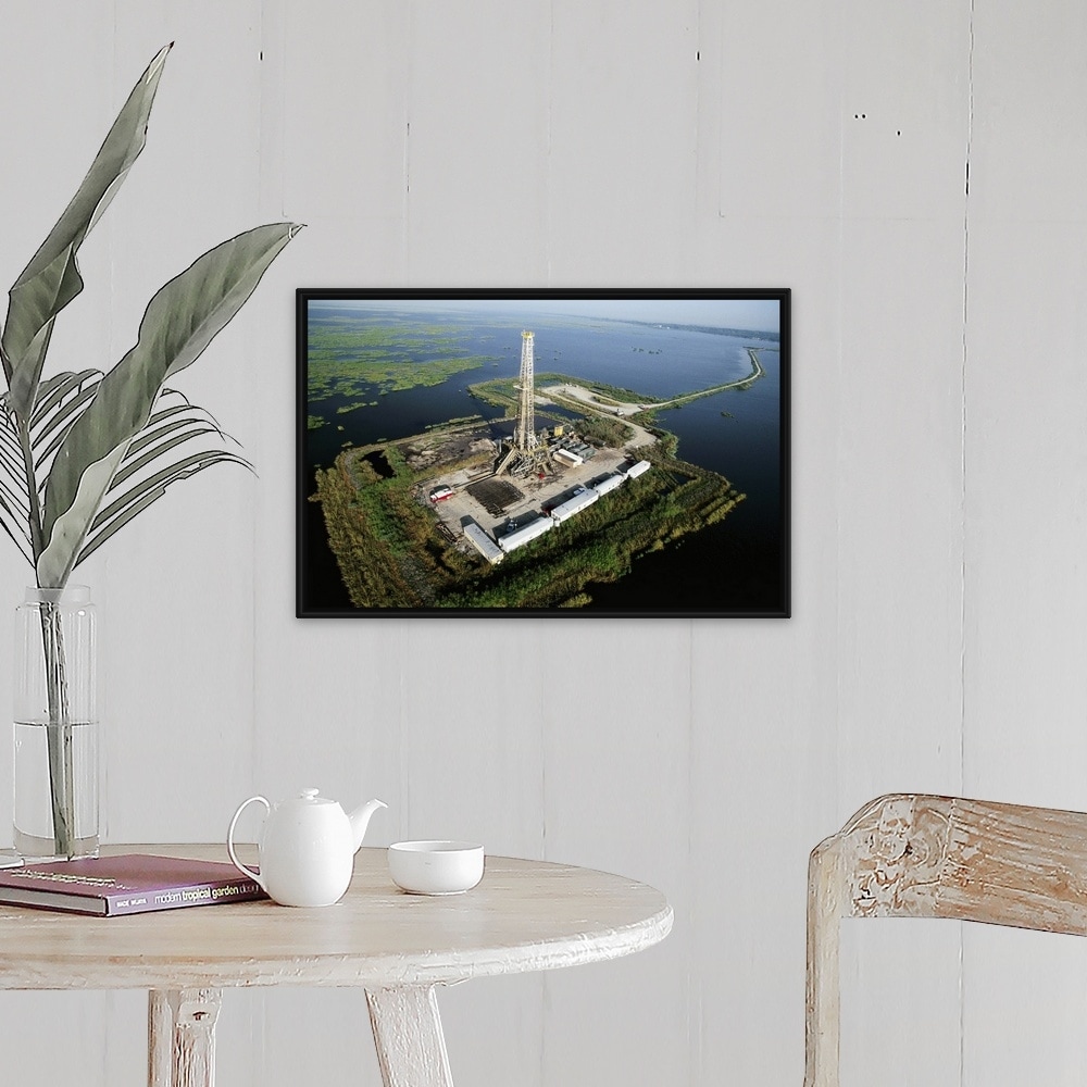 "Aerial View of Oil Drilling Platform in Marsh" Black Float Frame Canvas Art