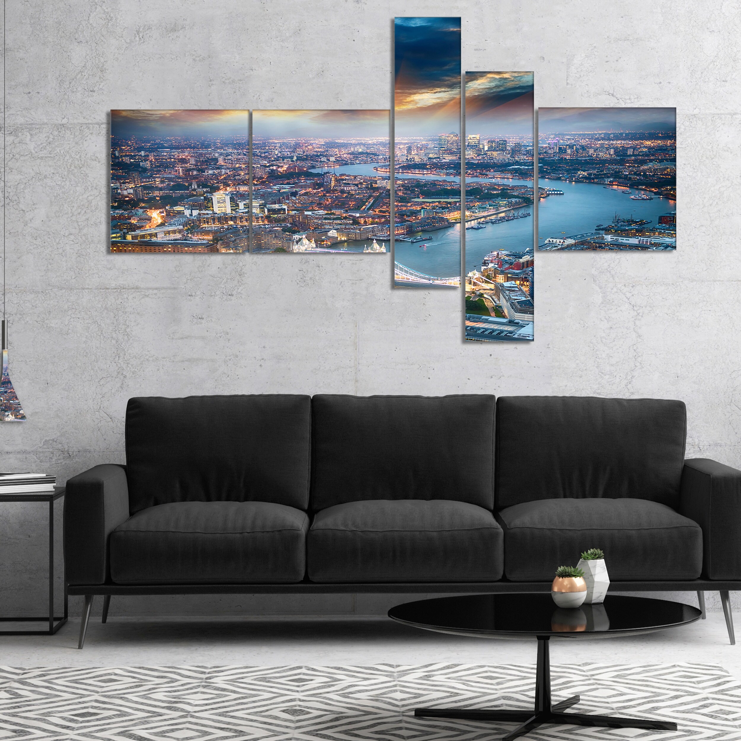Designart "Aerial View of London at Dusk" Cityscape Photo Canvas Print - Blue