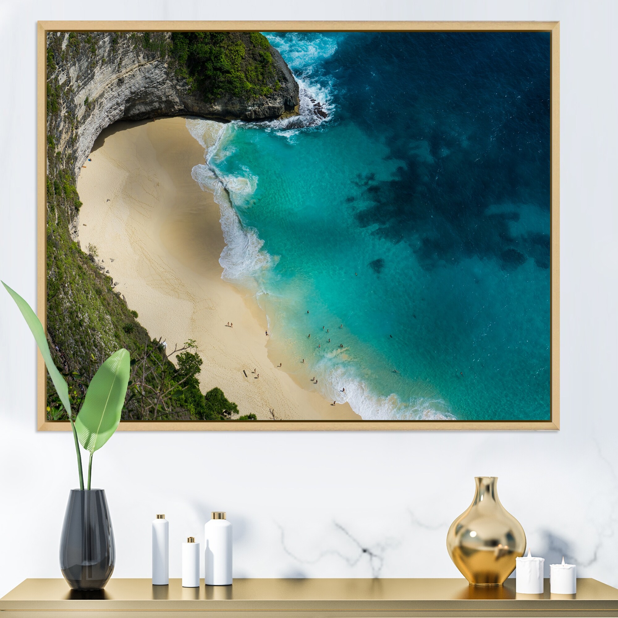 Designart "Aerial View of Idyllic Blue Ocean Beach" Traditional Framed Canvas Wall Art Print