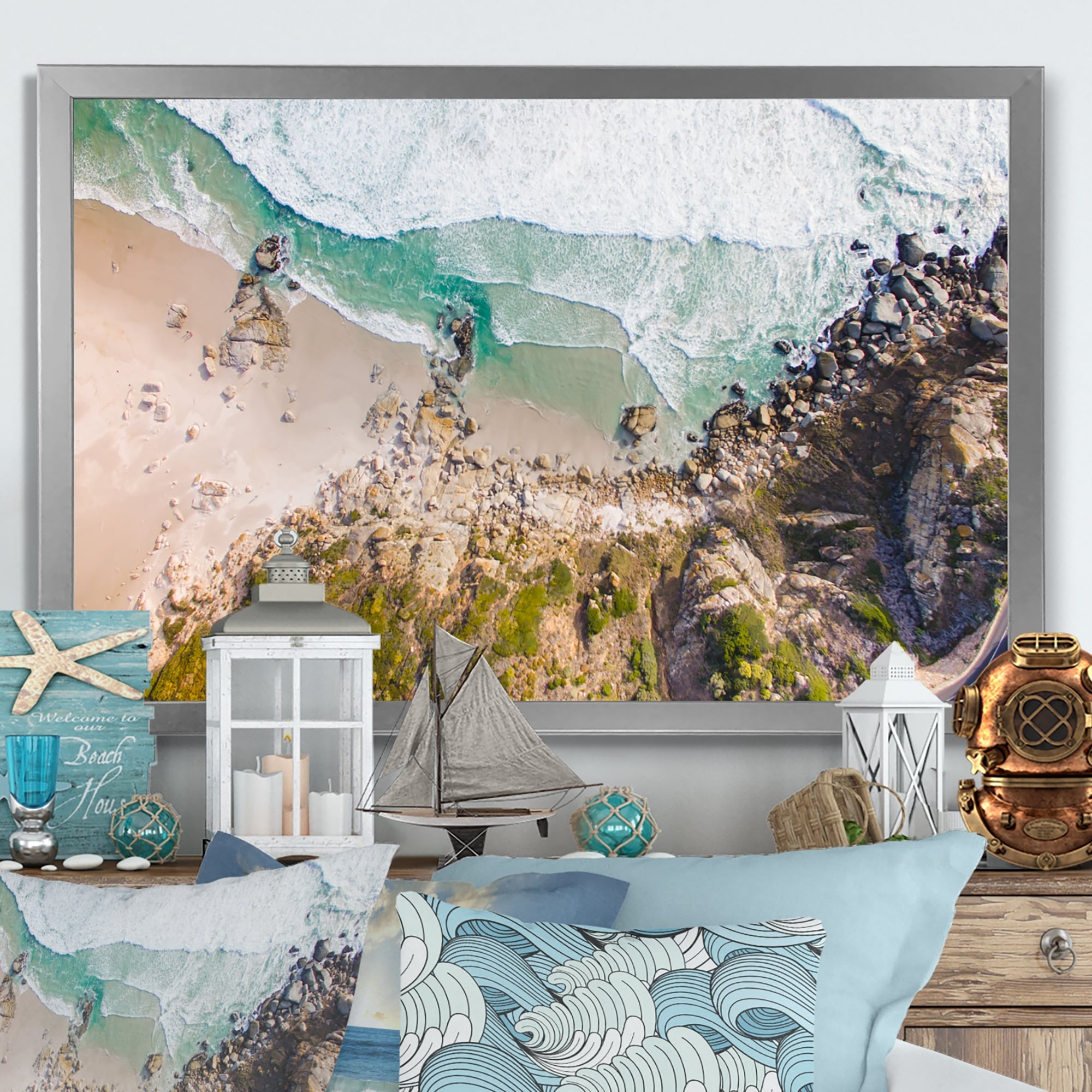 Designart "Beach Rocks And Shore Aerial View" Nautical & Coastal Framed Art Print