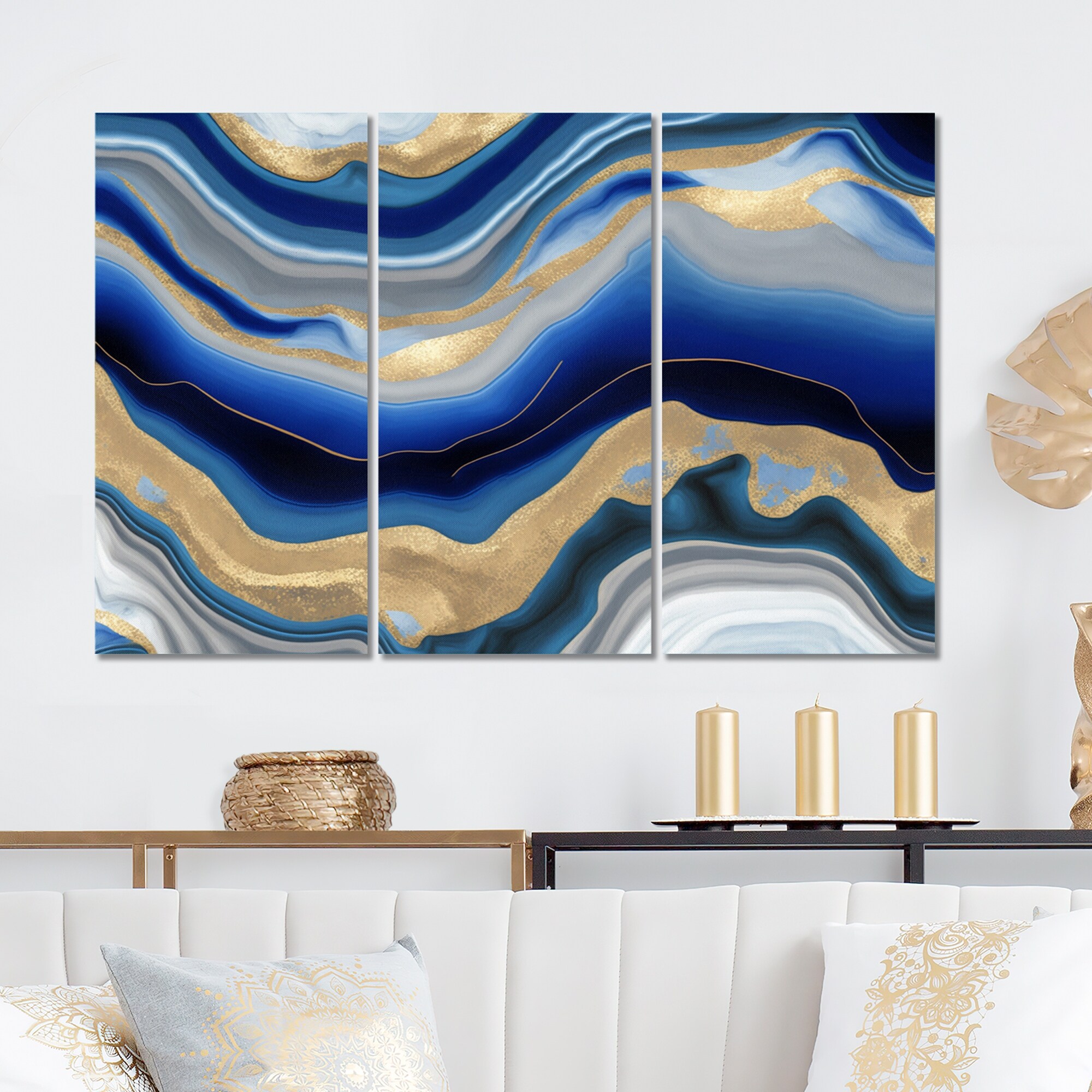 Designart "Vibrant Blue And Gold Agate III" Transitional Canvas Art Print - 3 Panels