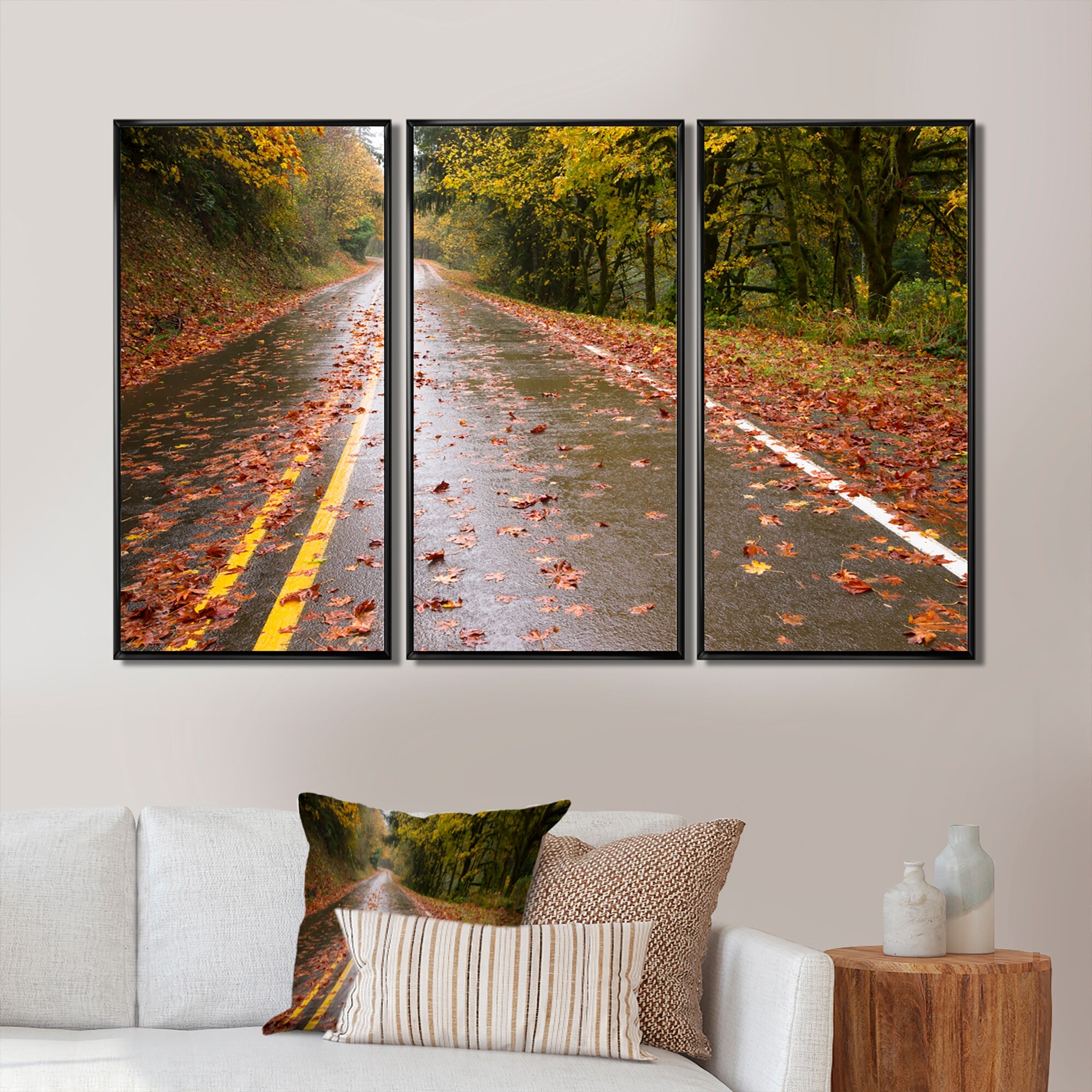 Designart "Wet Rainy Road in Forest" Landscape Framed Canvas Wall Art Print Set of 3 - 4 Colors of Frames