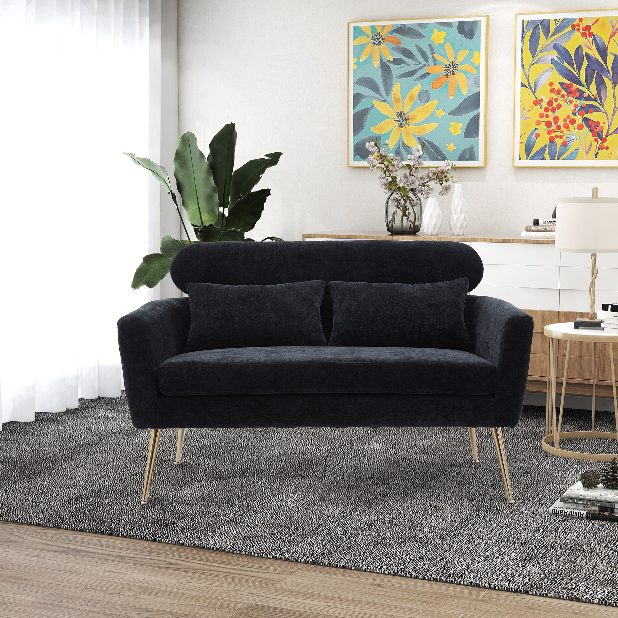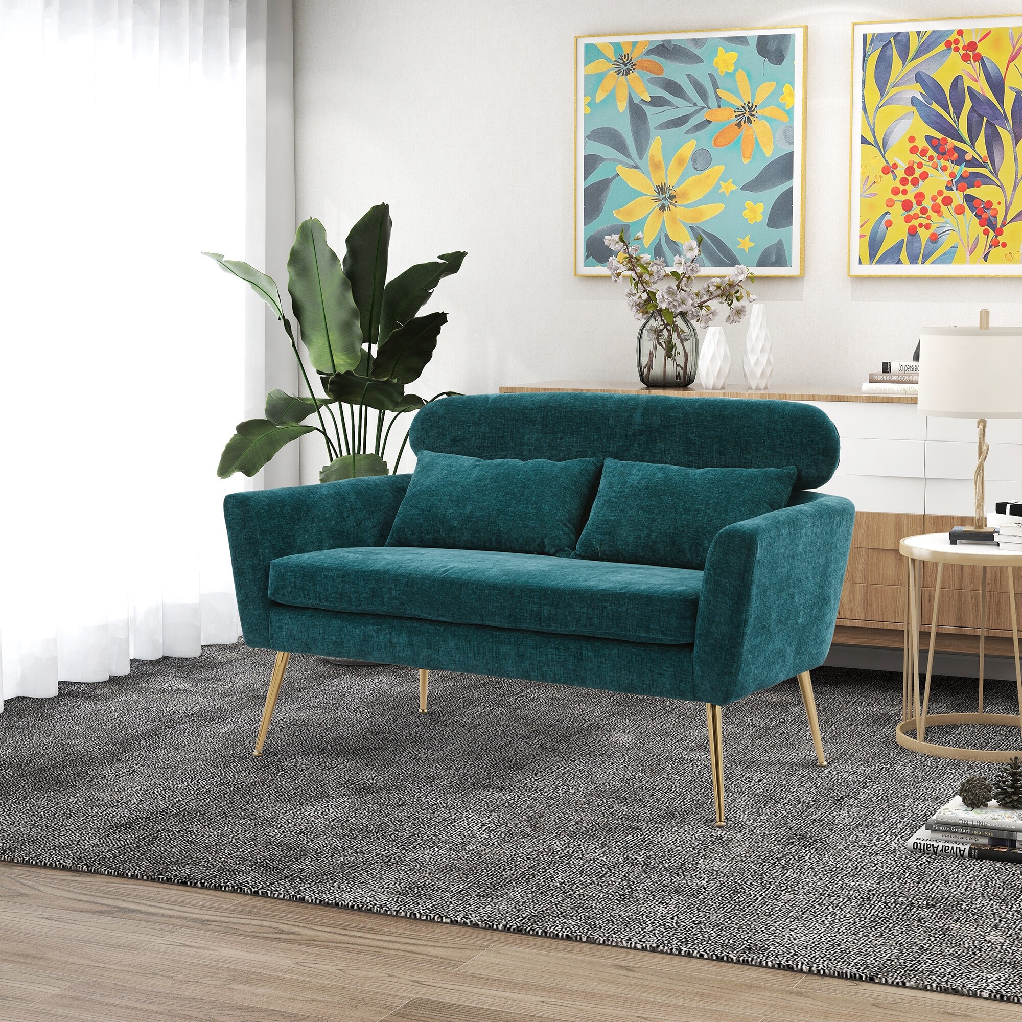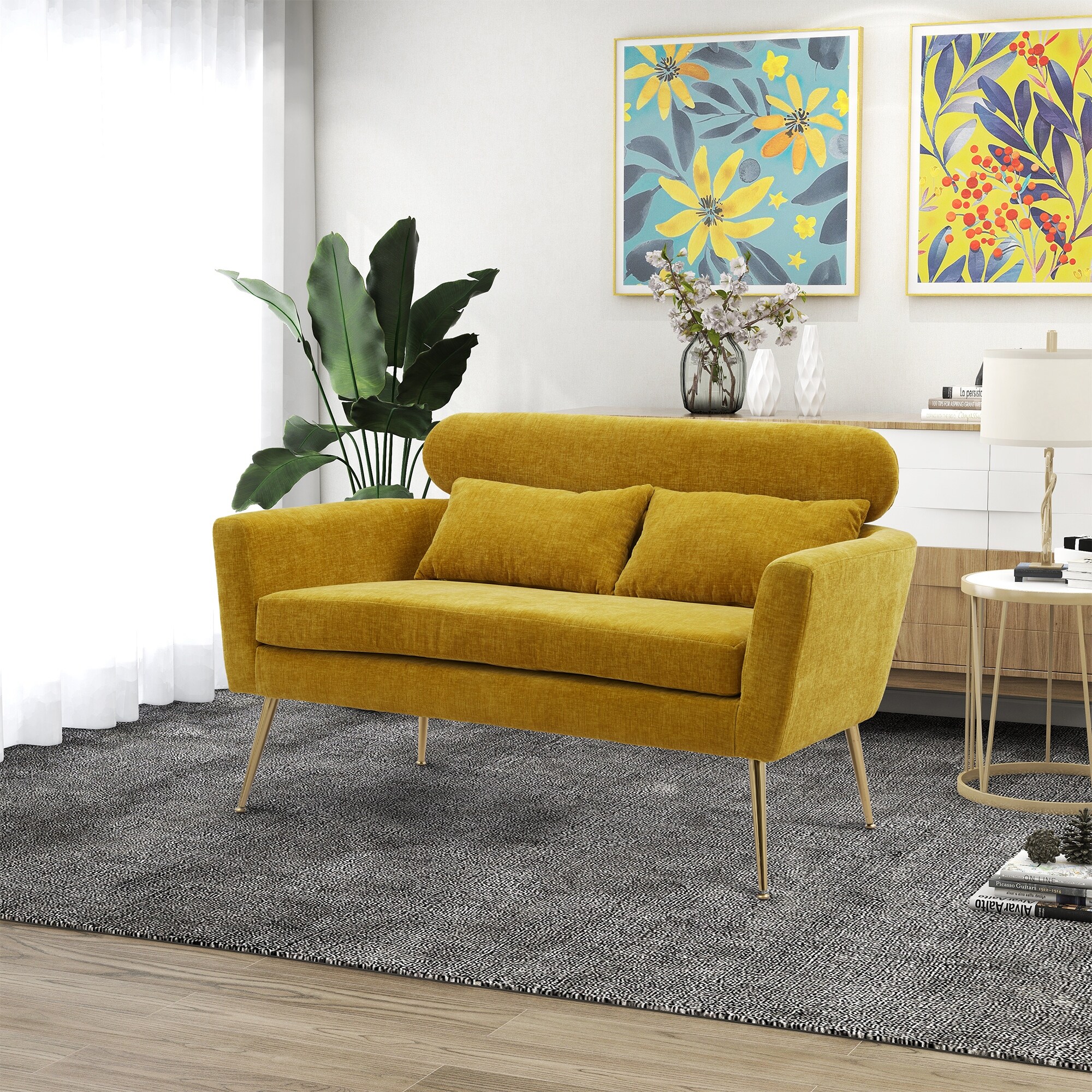 Chenille Loveseat Small Sofa Small Mini Room Couch Two-seater Sofa Padded Seat Arm Chairs with 2 Throw Pillows & Metal Legs