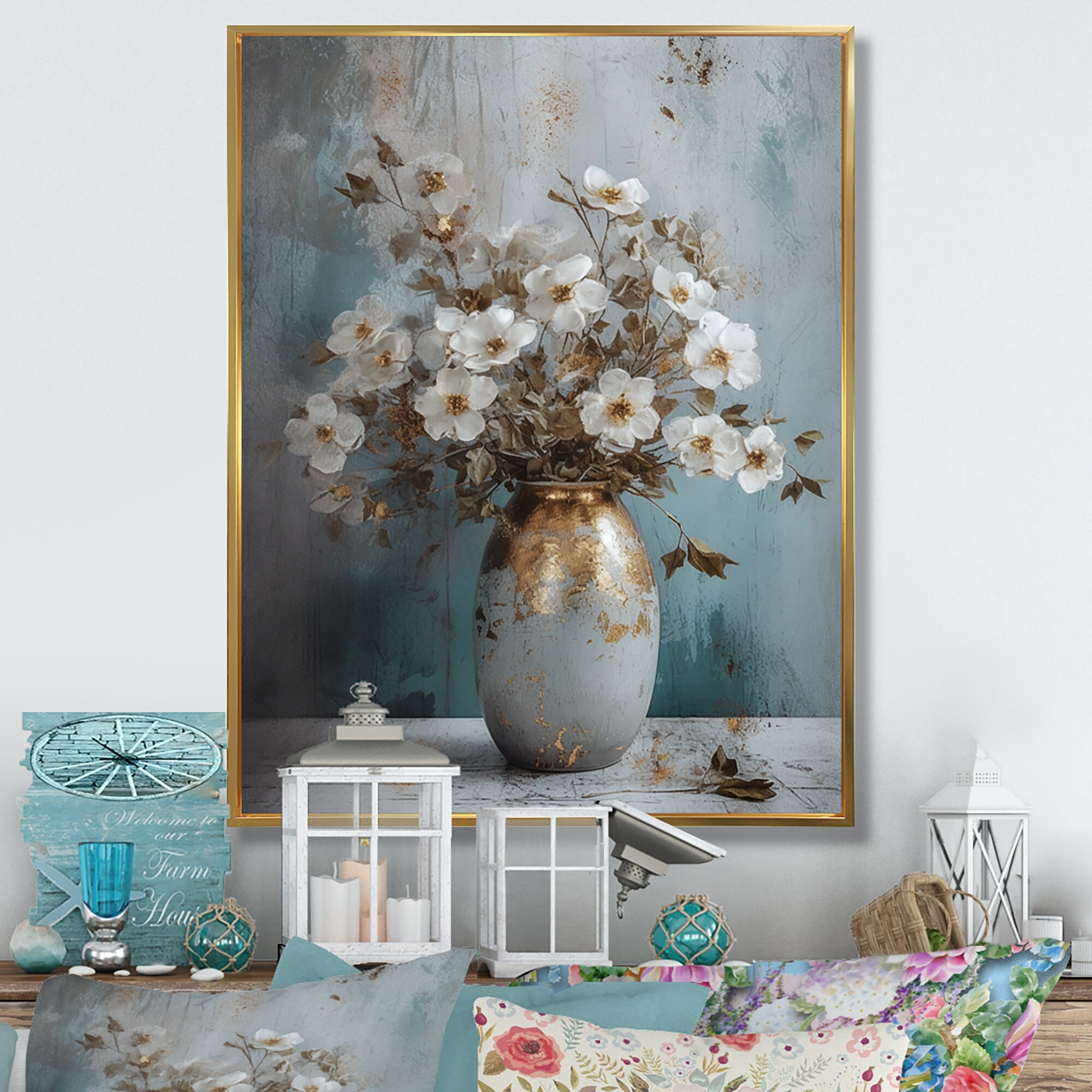 Designart "Golden White Floral Arrangement in Vase Iii" Floral Framed Canvas Print