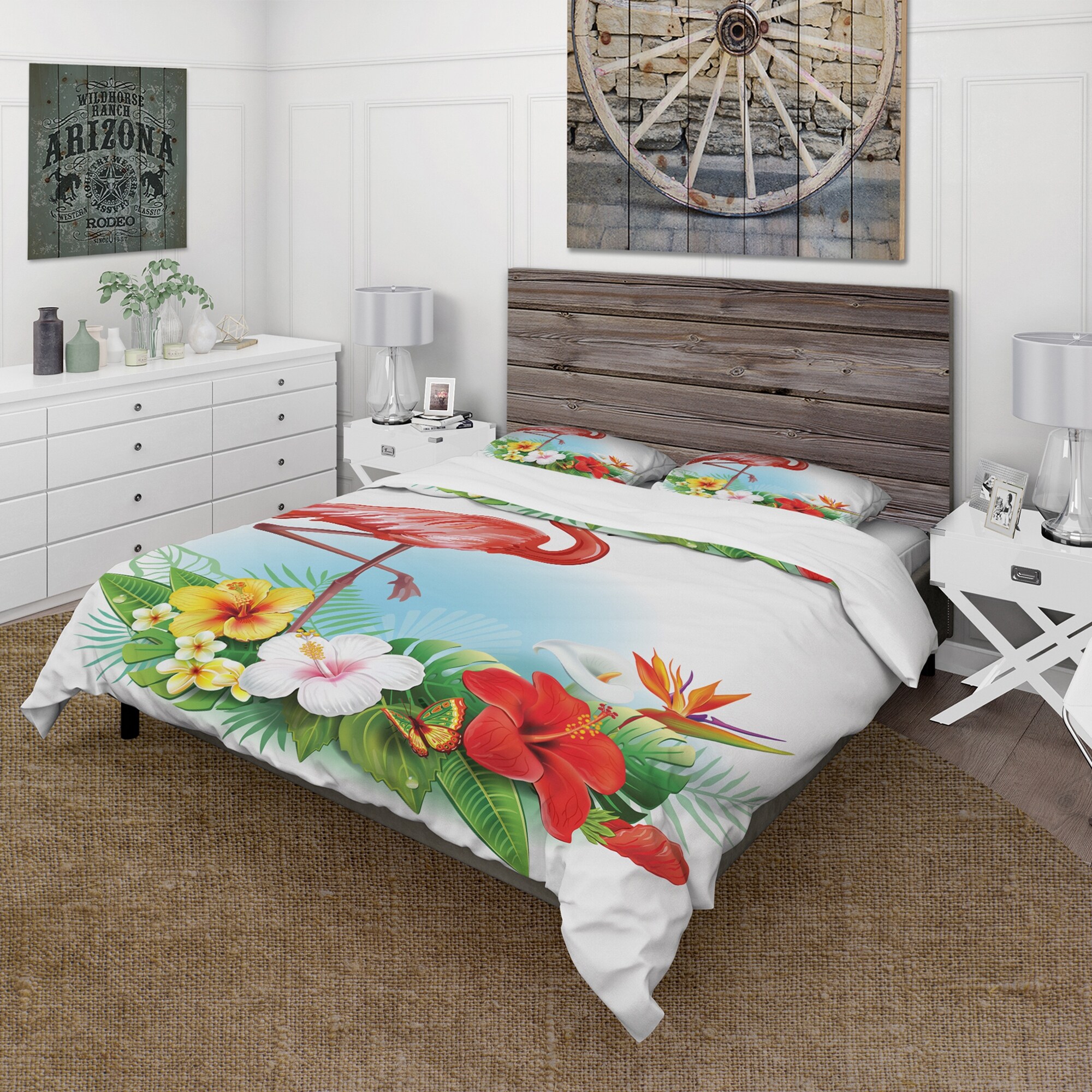 Designart 'Arrangement with Tropical Flowers and Flamingo' Traditional Duvet Cover Set