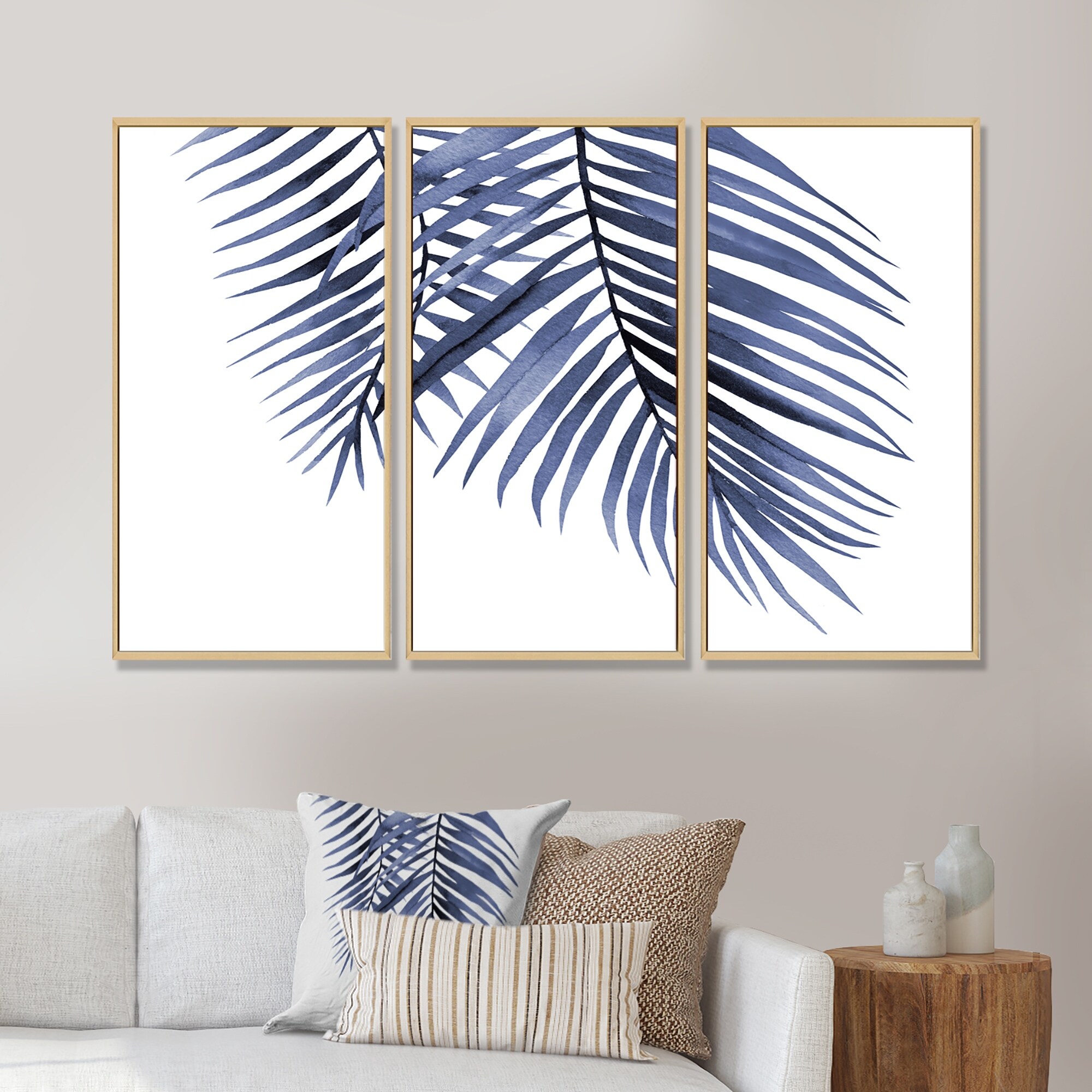 Designart "Blue Palm Leaves Abstract Tropical Branches" Traditional Framed Artwork Set of 3 - 4 Colors of Frames