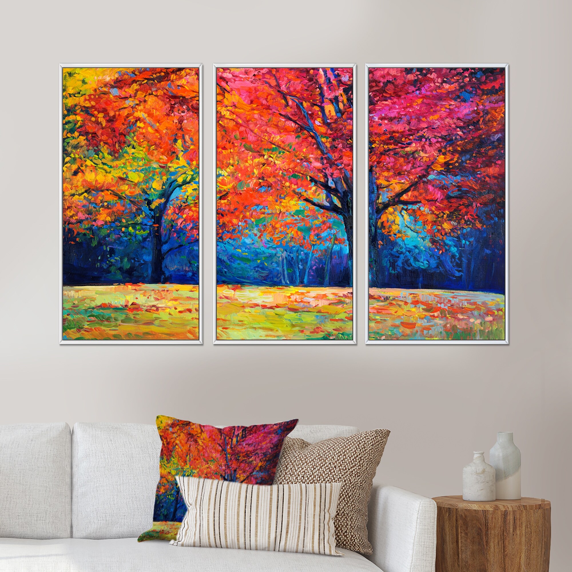 Designart "Vibrant Red Tree in Autumn Landscape" Traditional Framed Wall Decor Set of 3 - 4 Colors of Frames