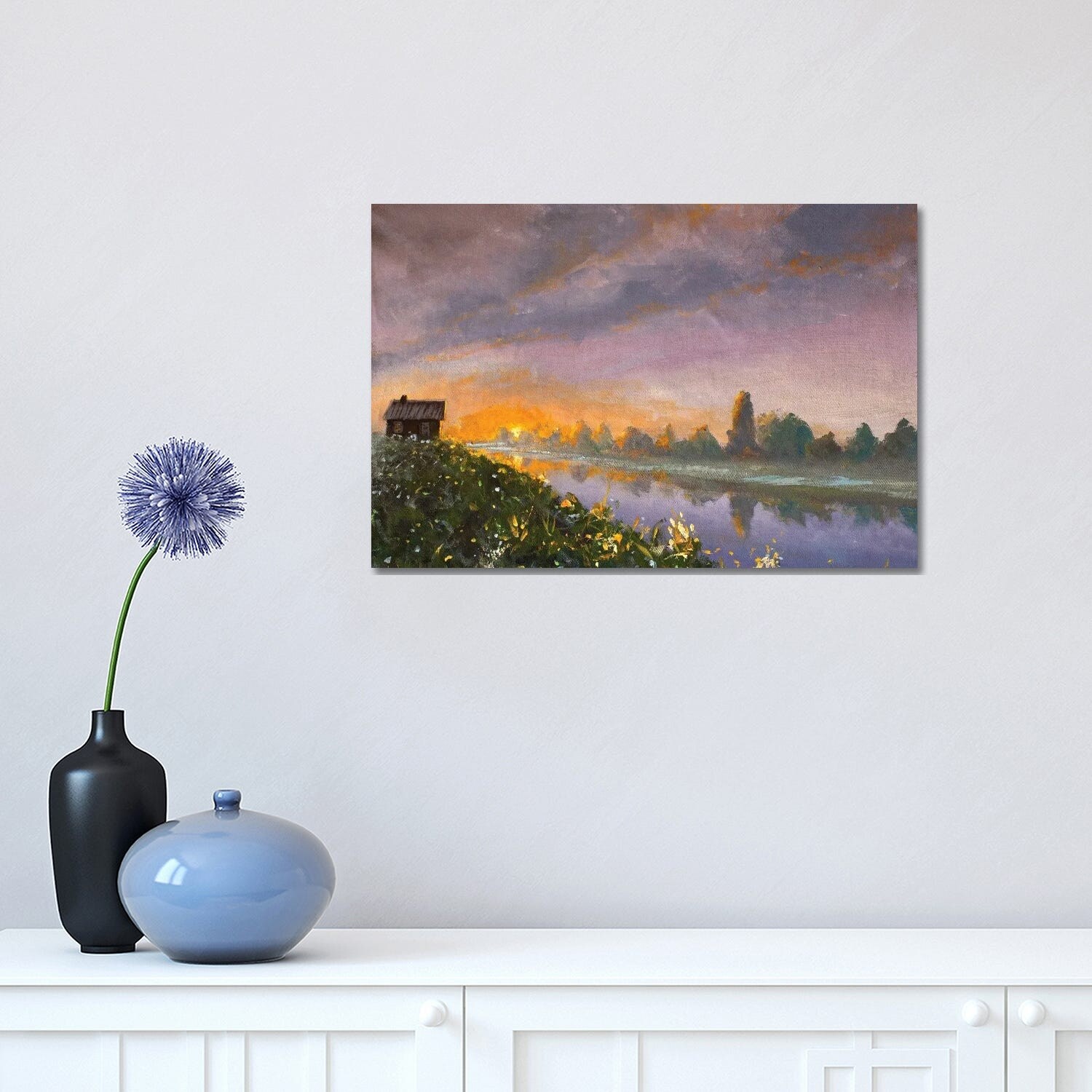 iCanvas "Old Rural Rustic Wooden House on River Bank At Dawn Sunset" by Valery Rybakow Canvas Print