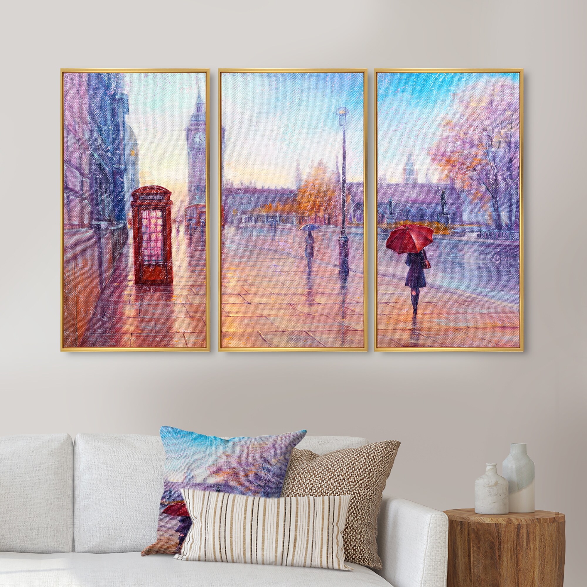 Designart "Big Ben and Woman With Red Umbrella in London" French Country Framed Art Prints Set of 3 - 4 Colors of Frames