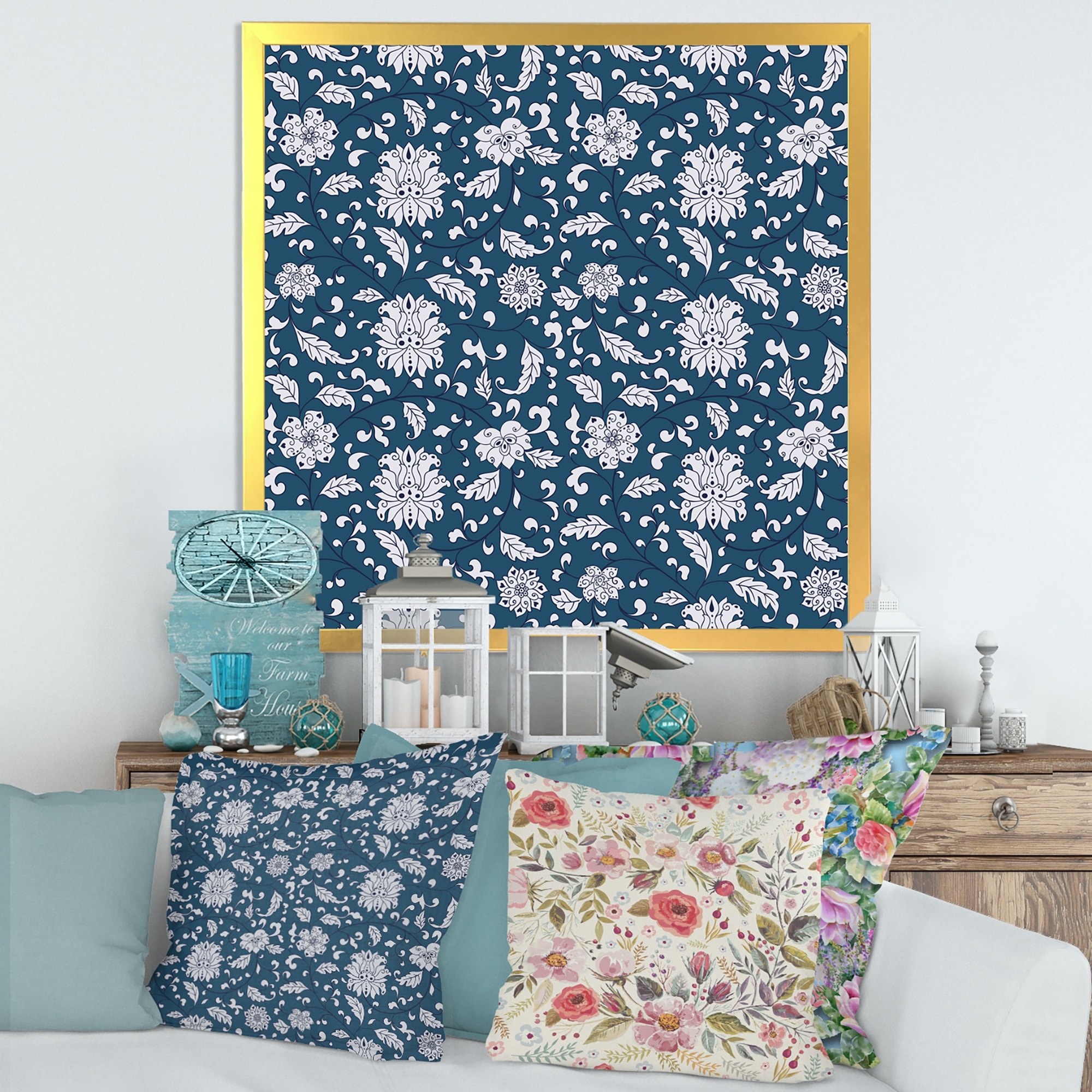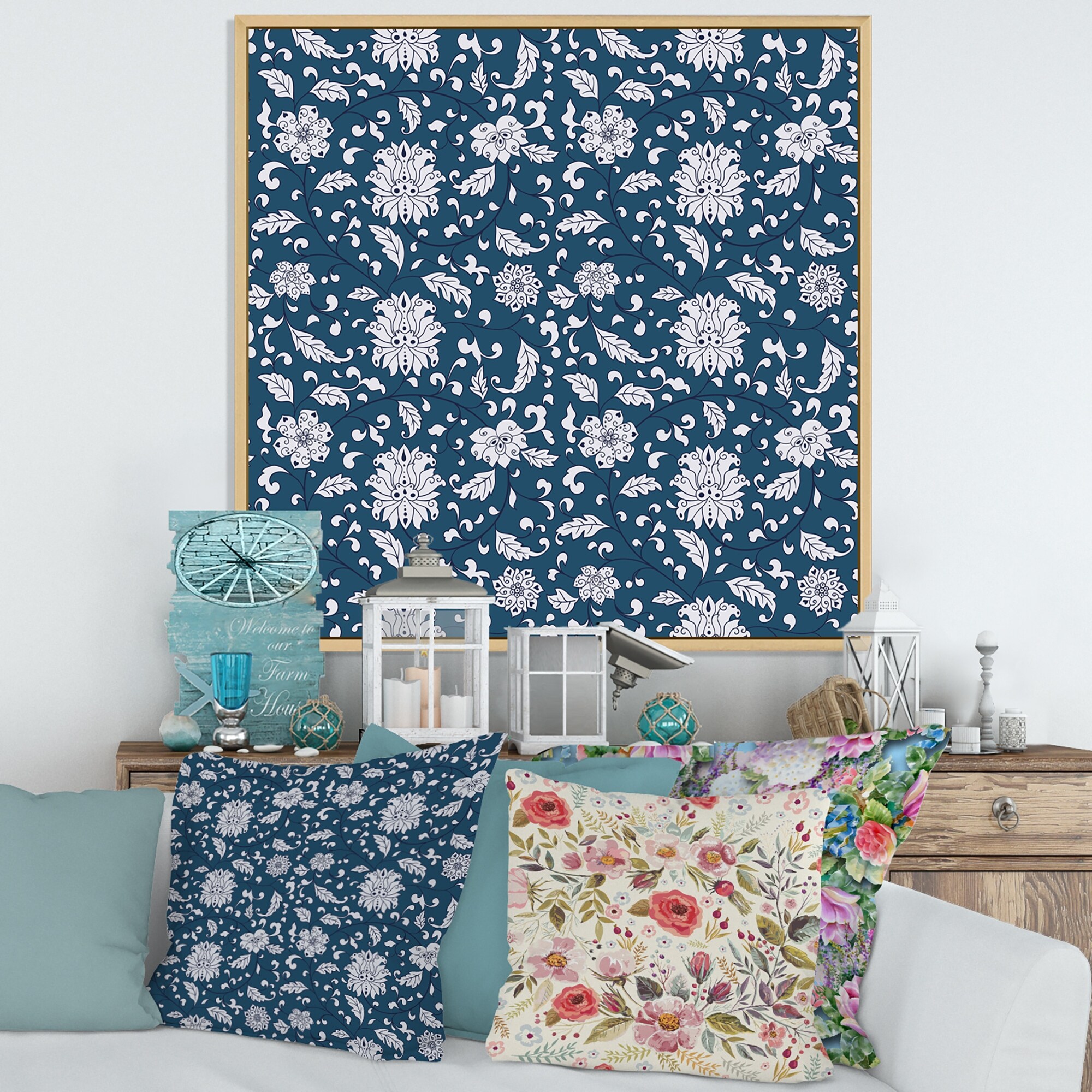 Designart "White Flowers on Dark Blu" Patterned Framed Art Print