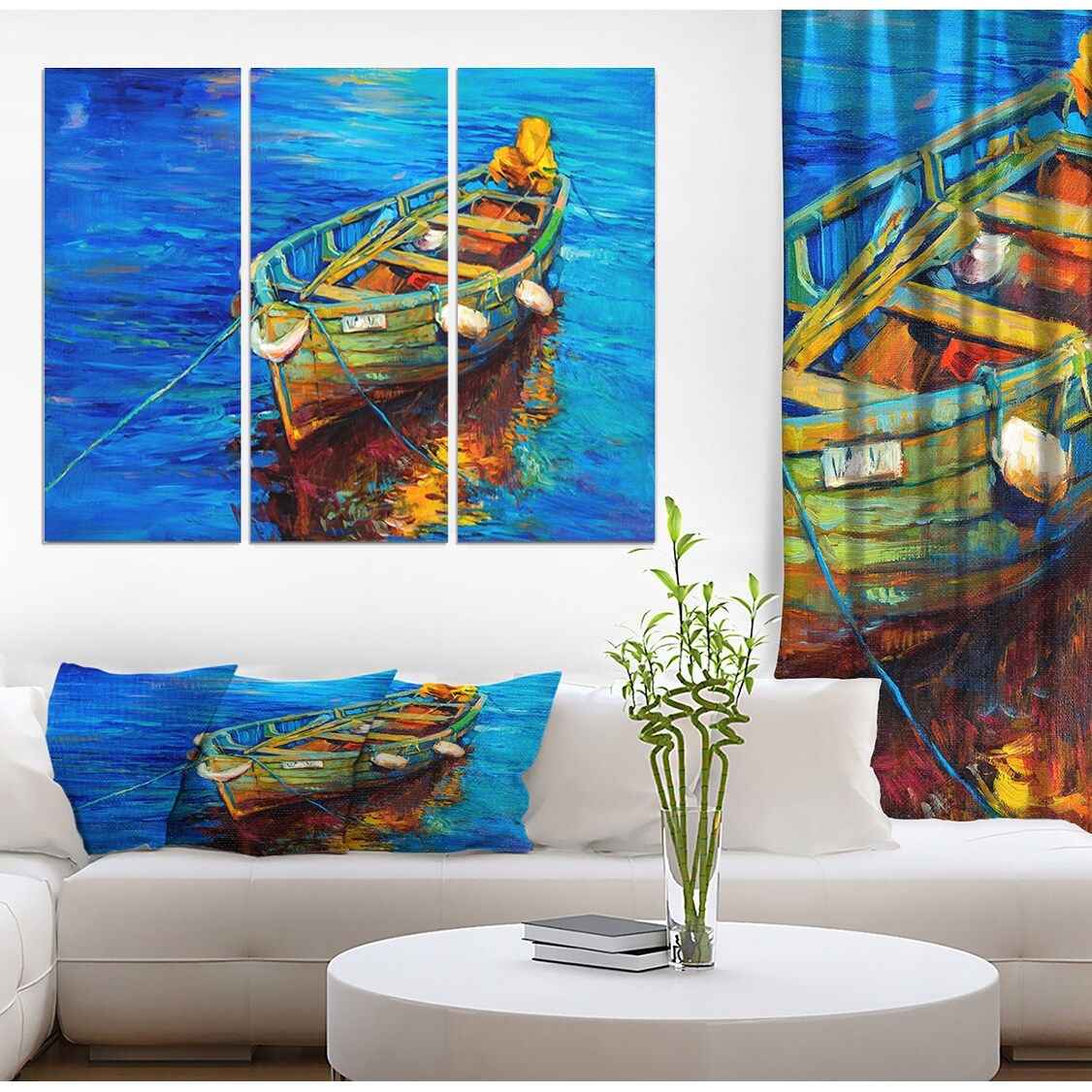 Designart "Single Fishing Boat at Blue Sea in" Sea & Shore Print on Wrapped Canvas set