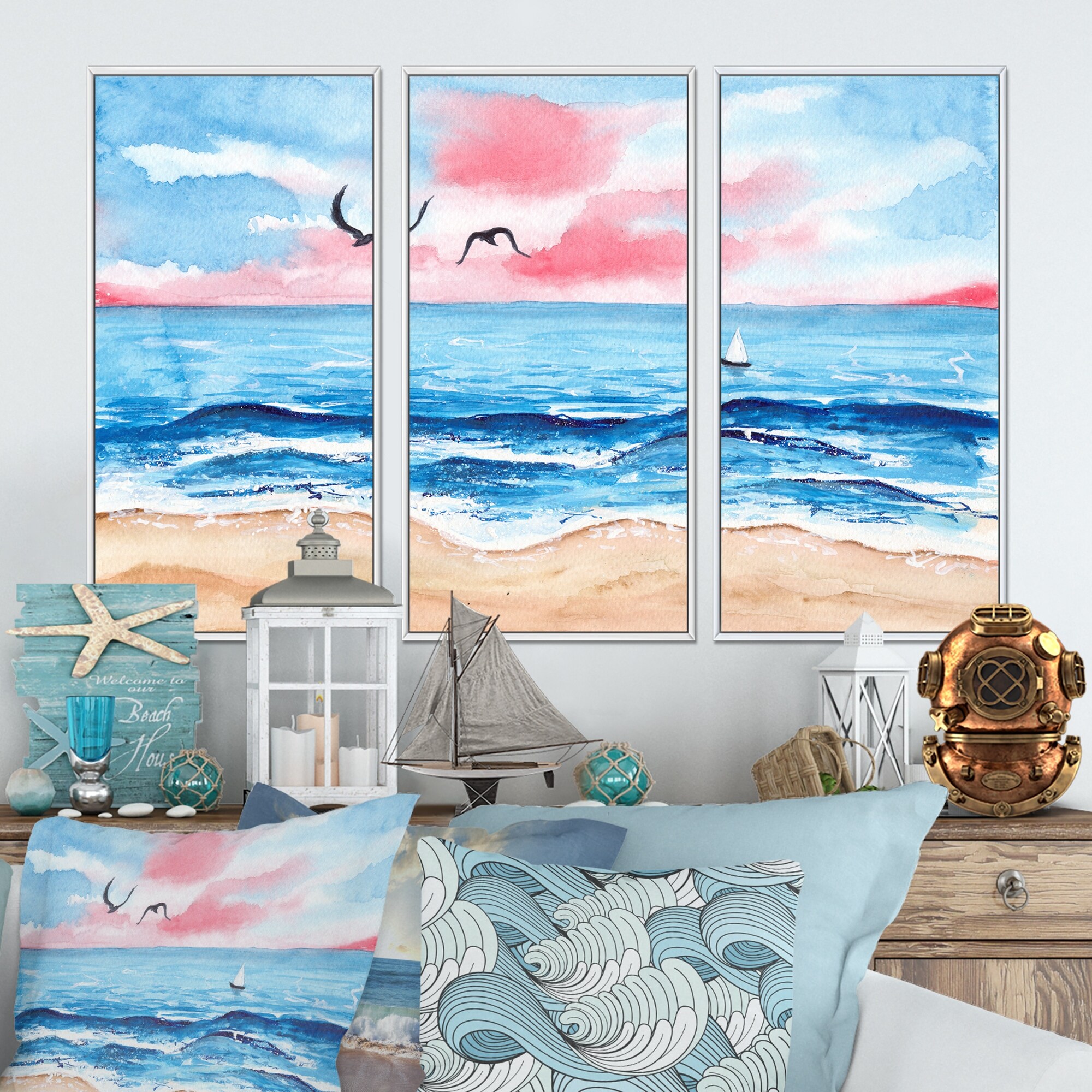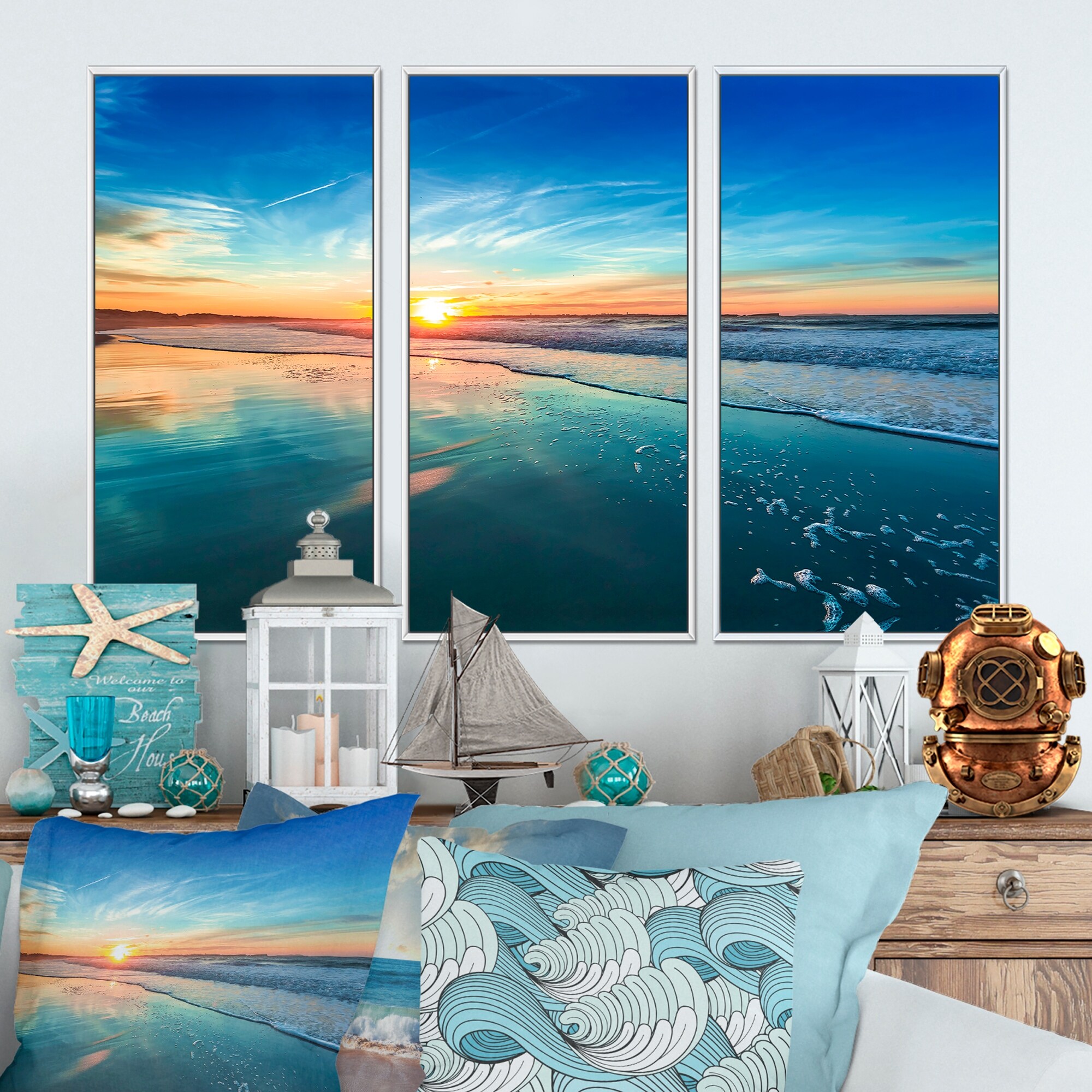 Designart "Blue Sea Sunset on Sandy Coastline" Sea & Shore Framed Art Prints Set of 3 - 4 Colors of Frames