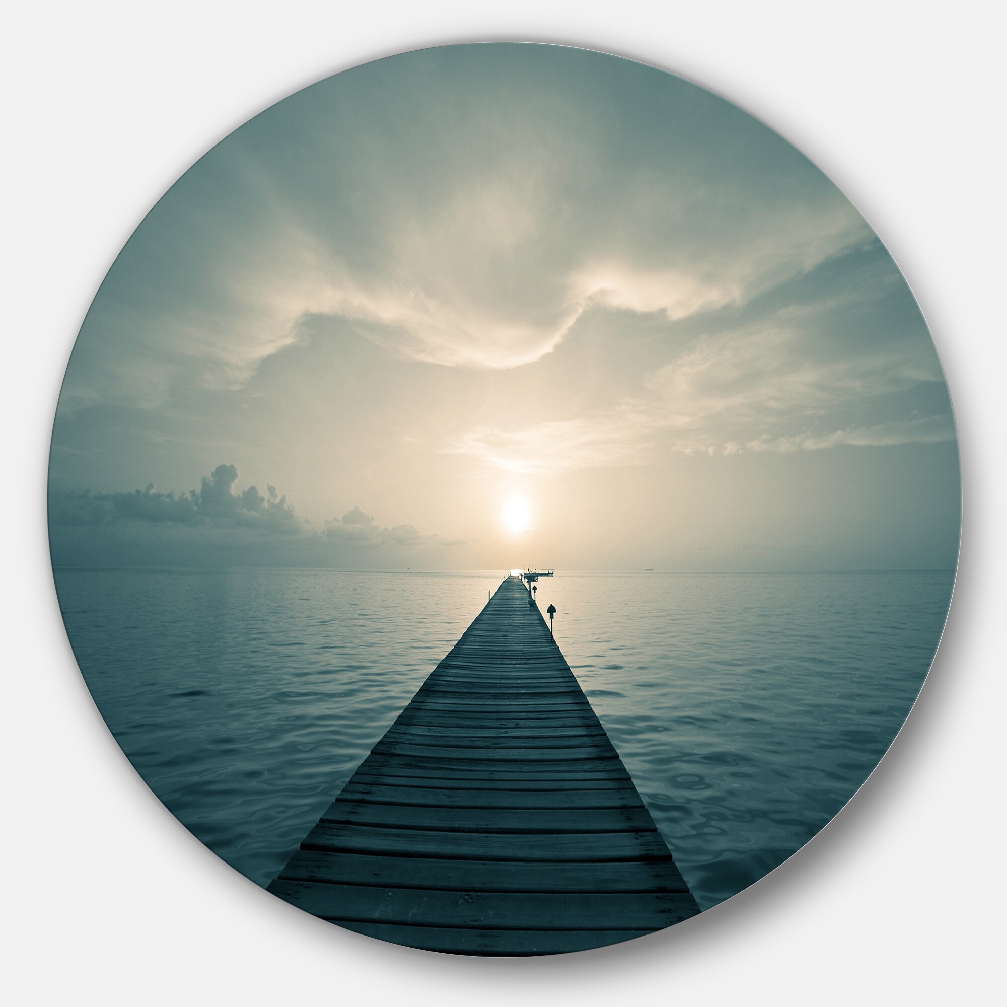 Designart 'Dark Boardwalk into Blue Sea' Sea Bridge Round Wall Art
