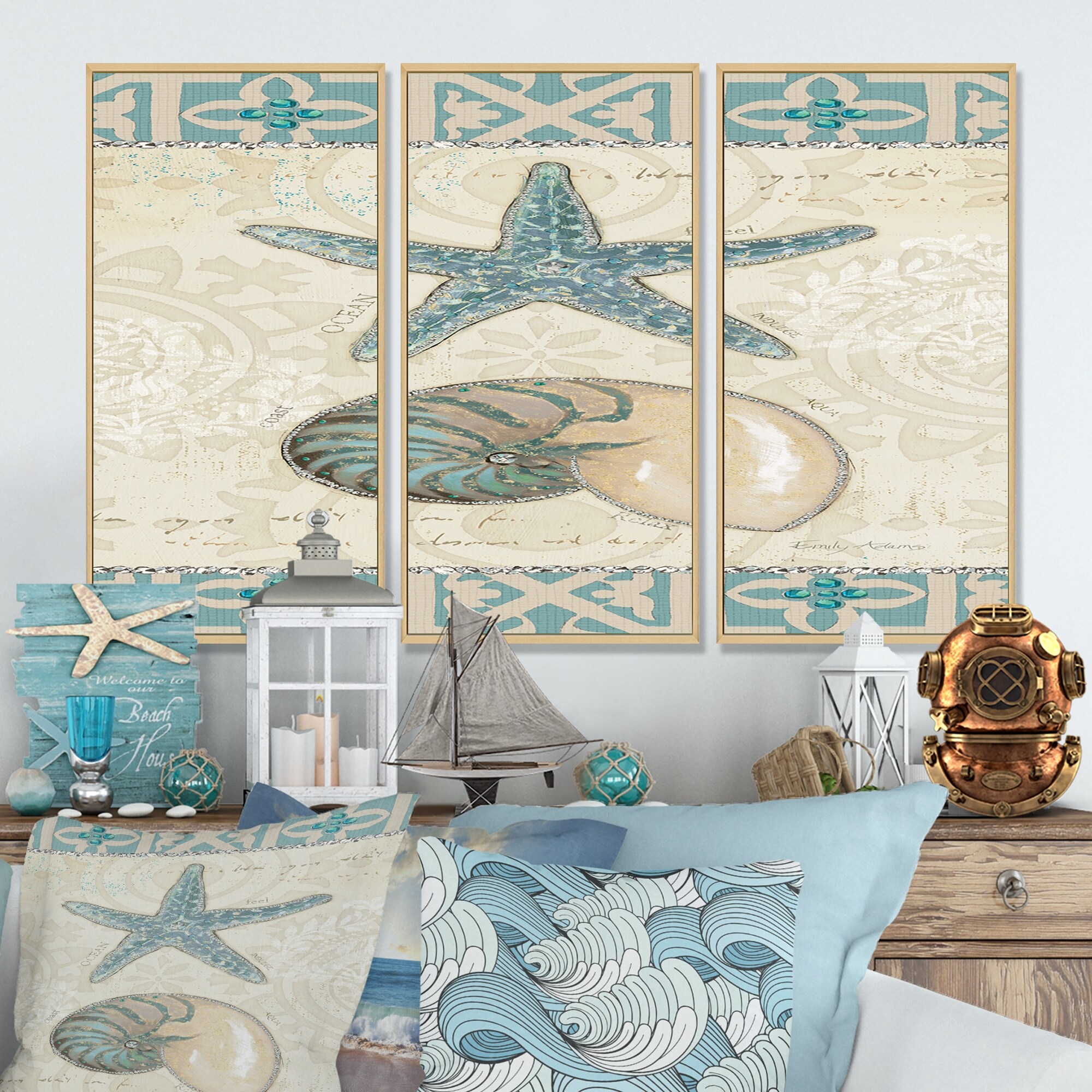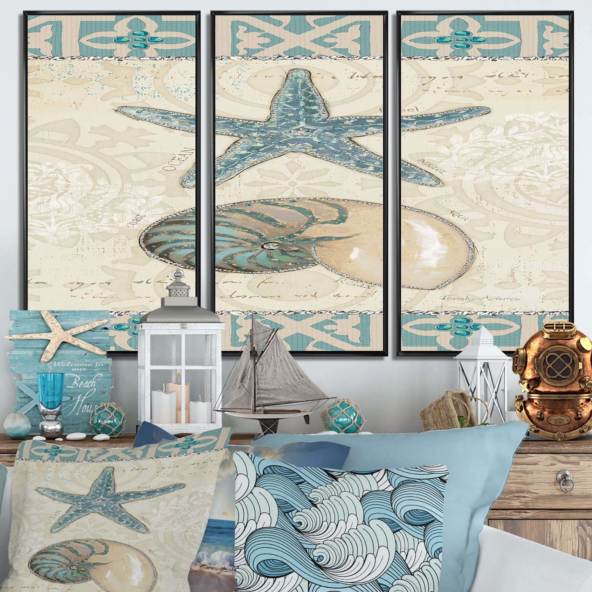 Designart "Seastar and Blue Sea Shell I" Nautical & Coastal Framed Wall Art Set of 3 - 4 Colors of Frames