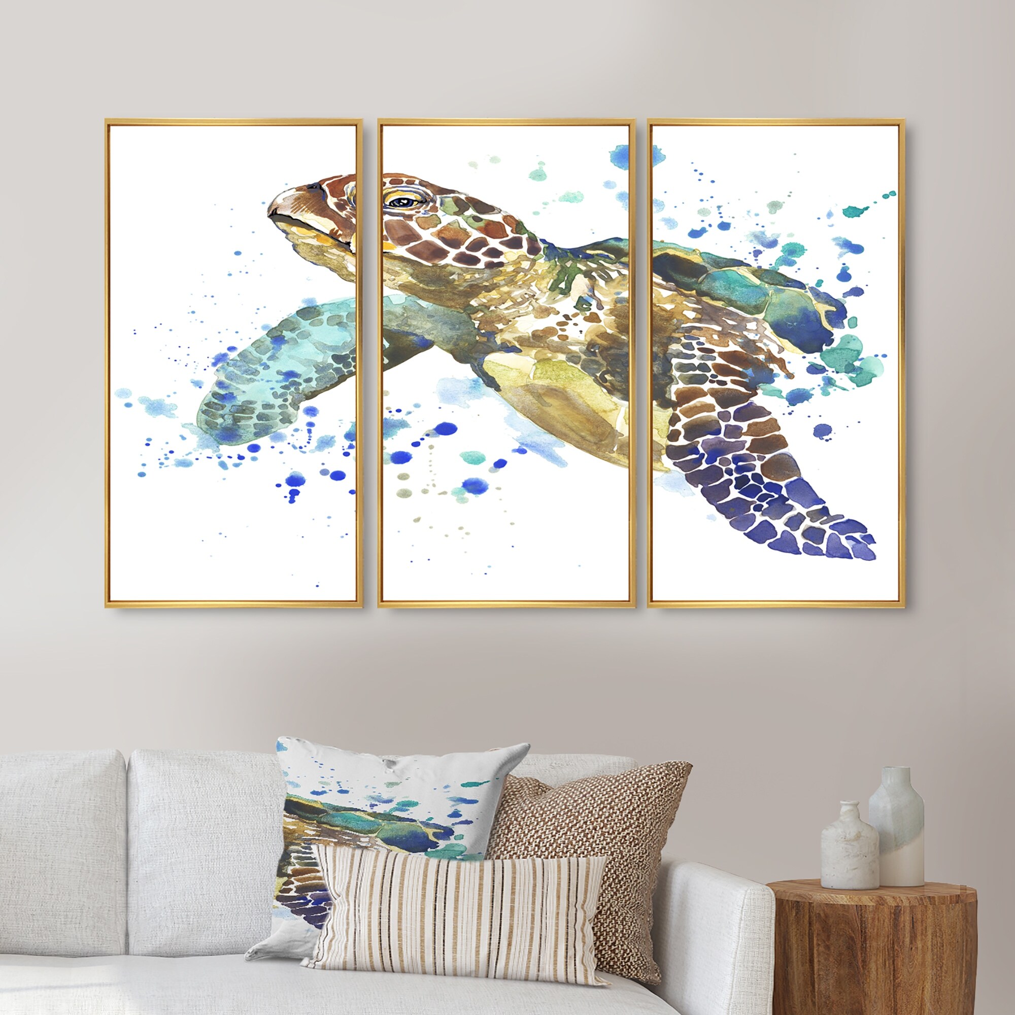 Designart "Blue Sea Turtle" Animal Framed Canvas Wall Art Print Set of 3 - 4 Colors of Frames