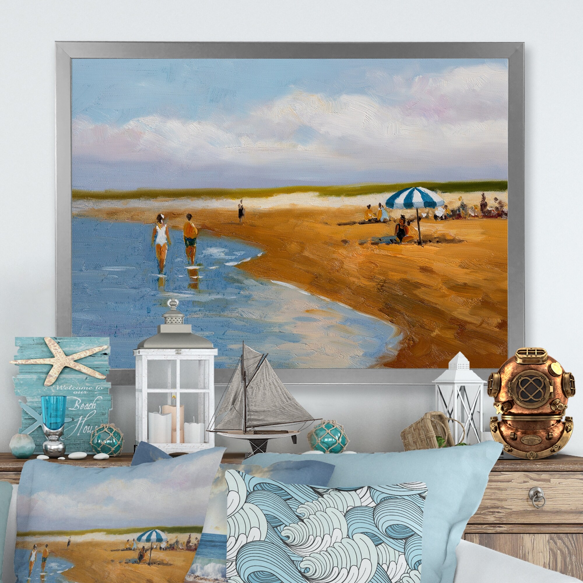 Designart "Sunset On Beautiful Sand Beach With Blue Sea Water" Nautical & Coastal Framed Art Print