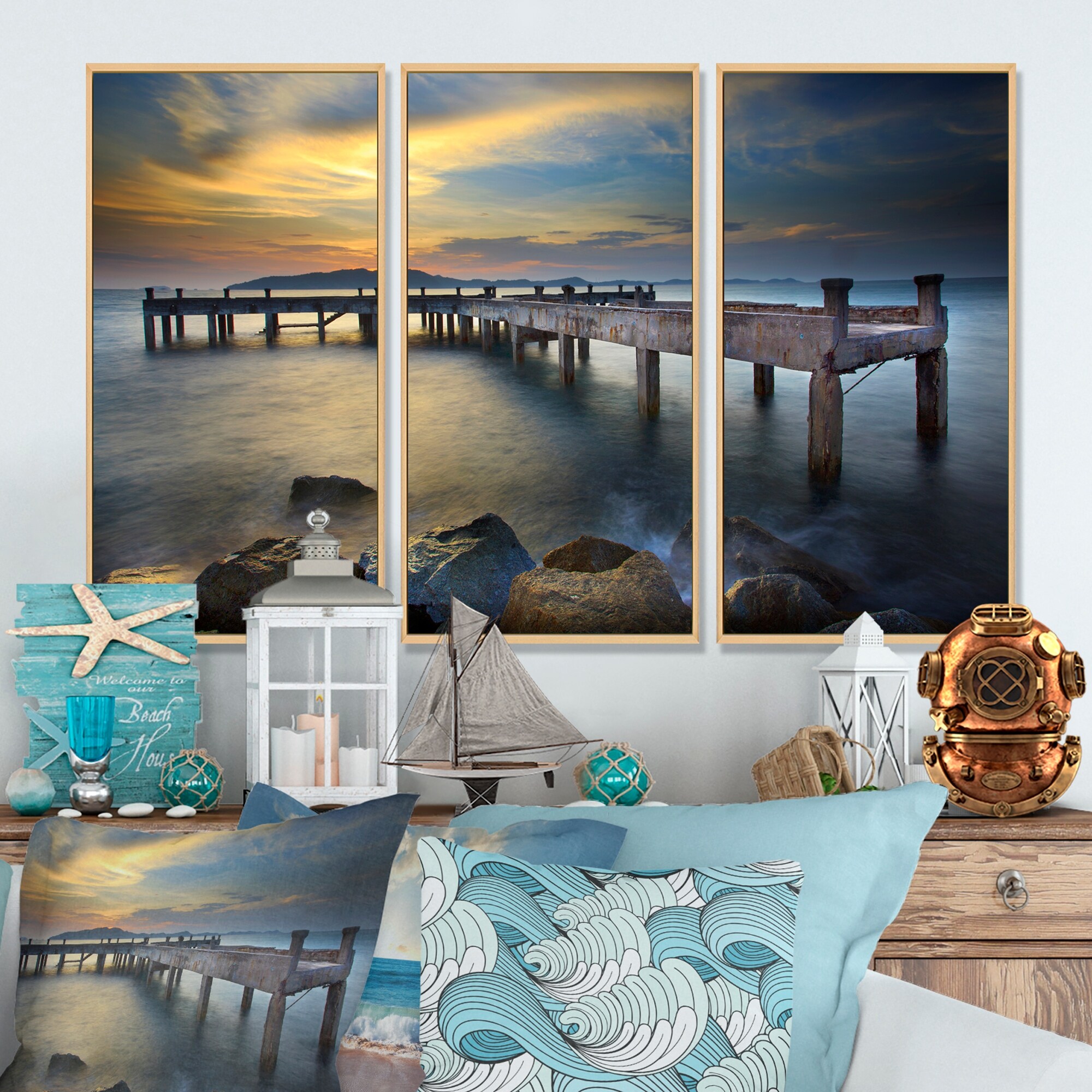Designart "Old Wood Boat Jetty into Blue Sea" Pier & Bridge Framed Art Set of 3 - 4 Colors of Frames