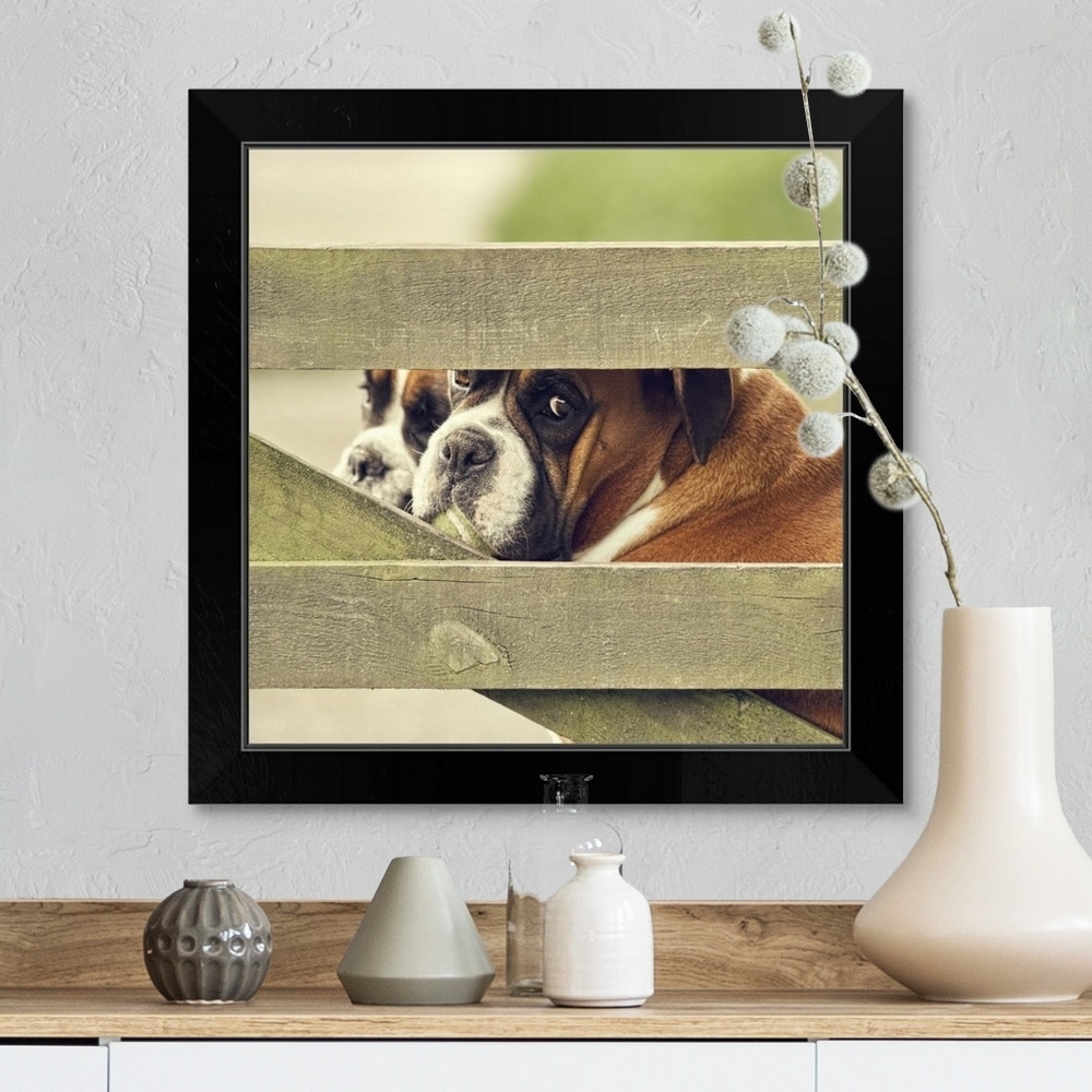 "Boxer dog at gate with ball in its mouth" Black Framed Print