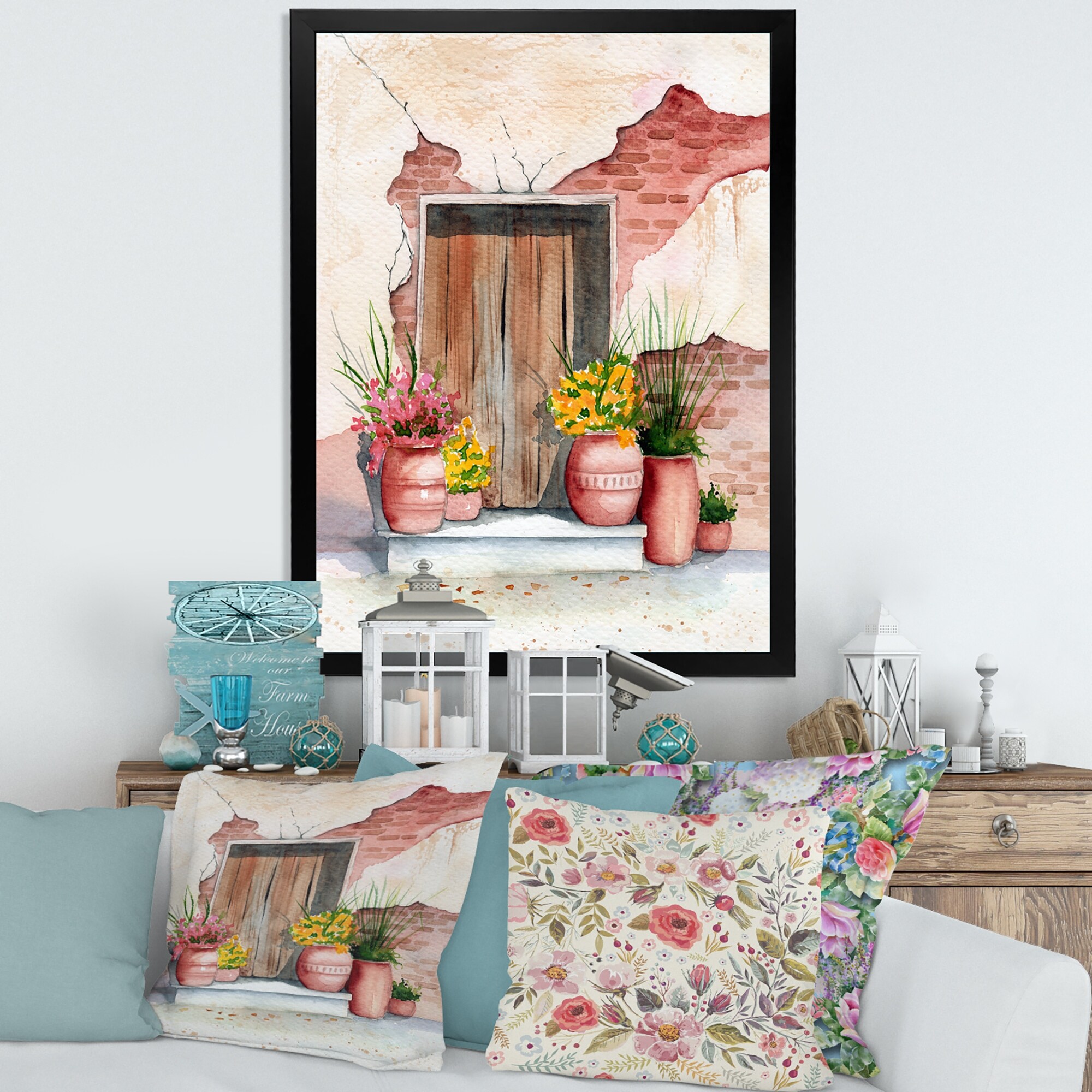 Designart "Old Wooden Door Brick Wall And Some Plants I" Vintage Framed Canvas Wall Art Print