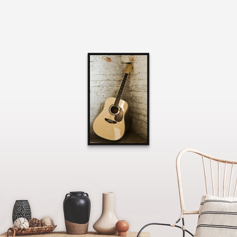 "Guitar leaning against brick wall" Black Float Frame Canvas Art