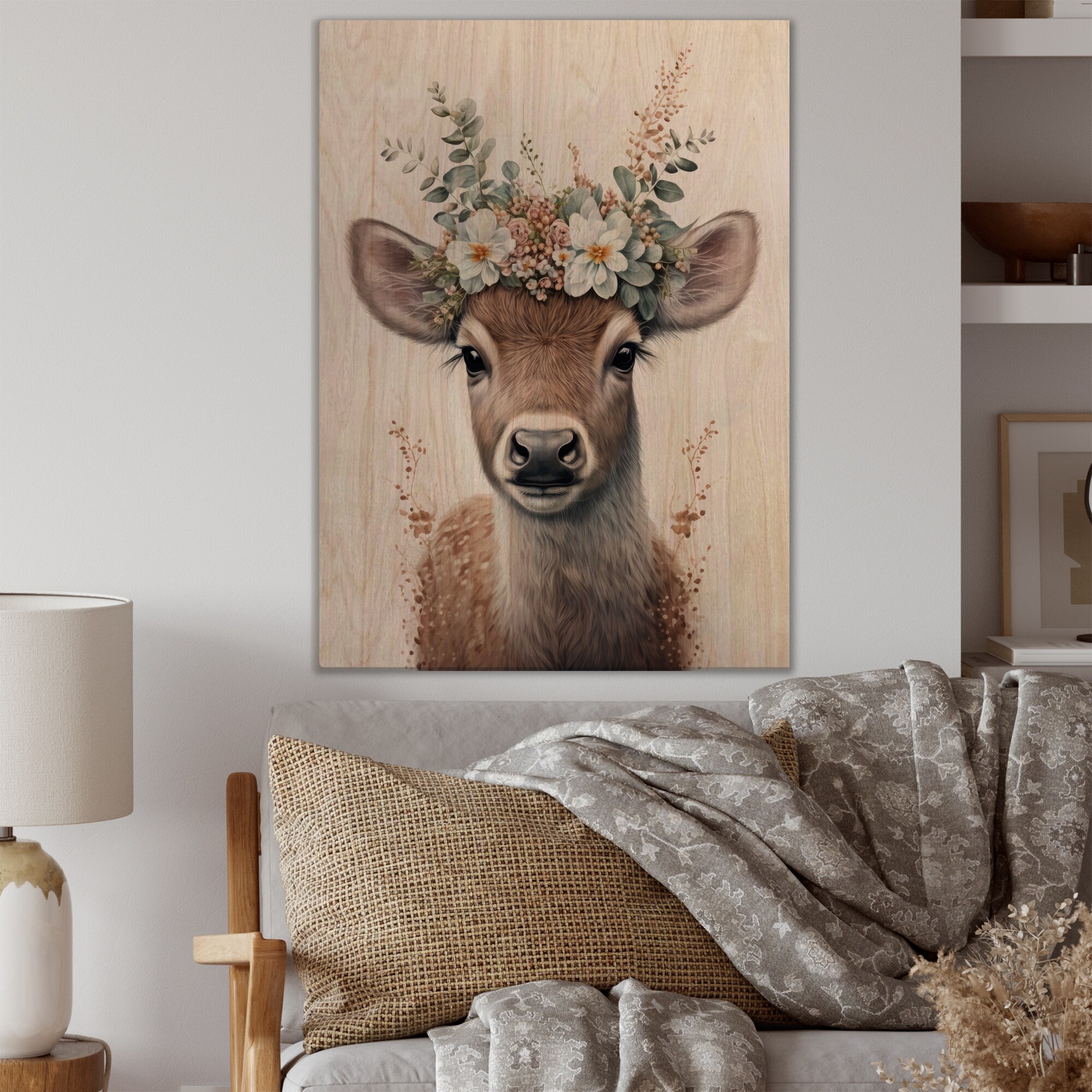 Designart 'Cute Baby Bull With Floral Crown'Animals Bull Wood Wall Art - Natural Pine Wood