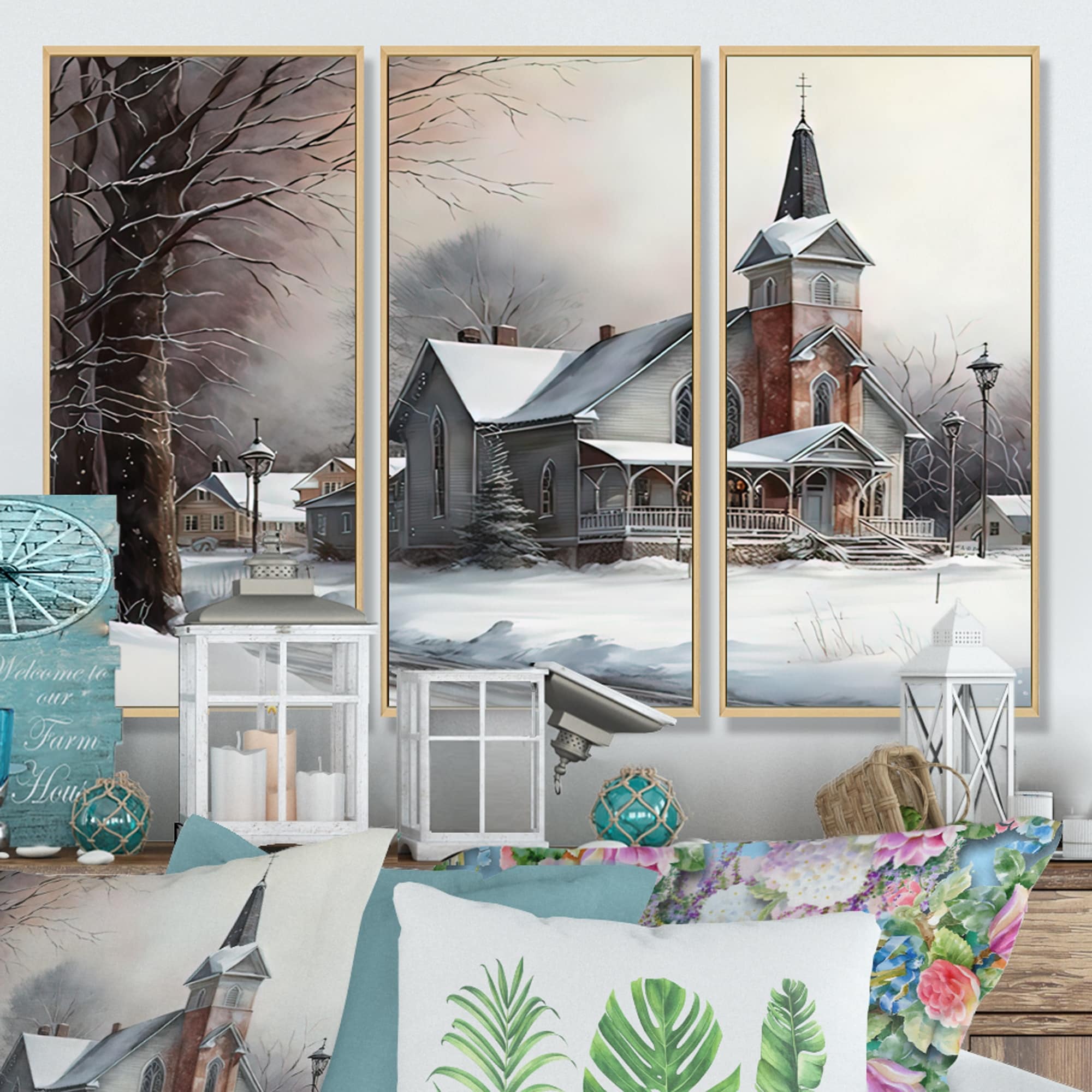 Designart "Church In Country During Winter V" Landscape Church Framed Canvas Art Print - 3 Panels