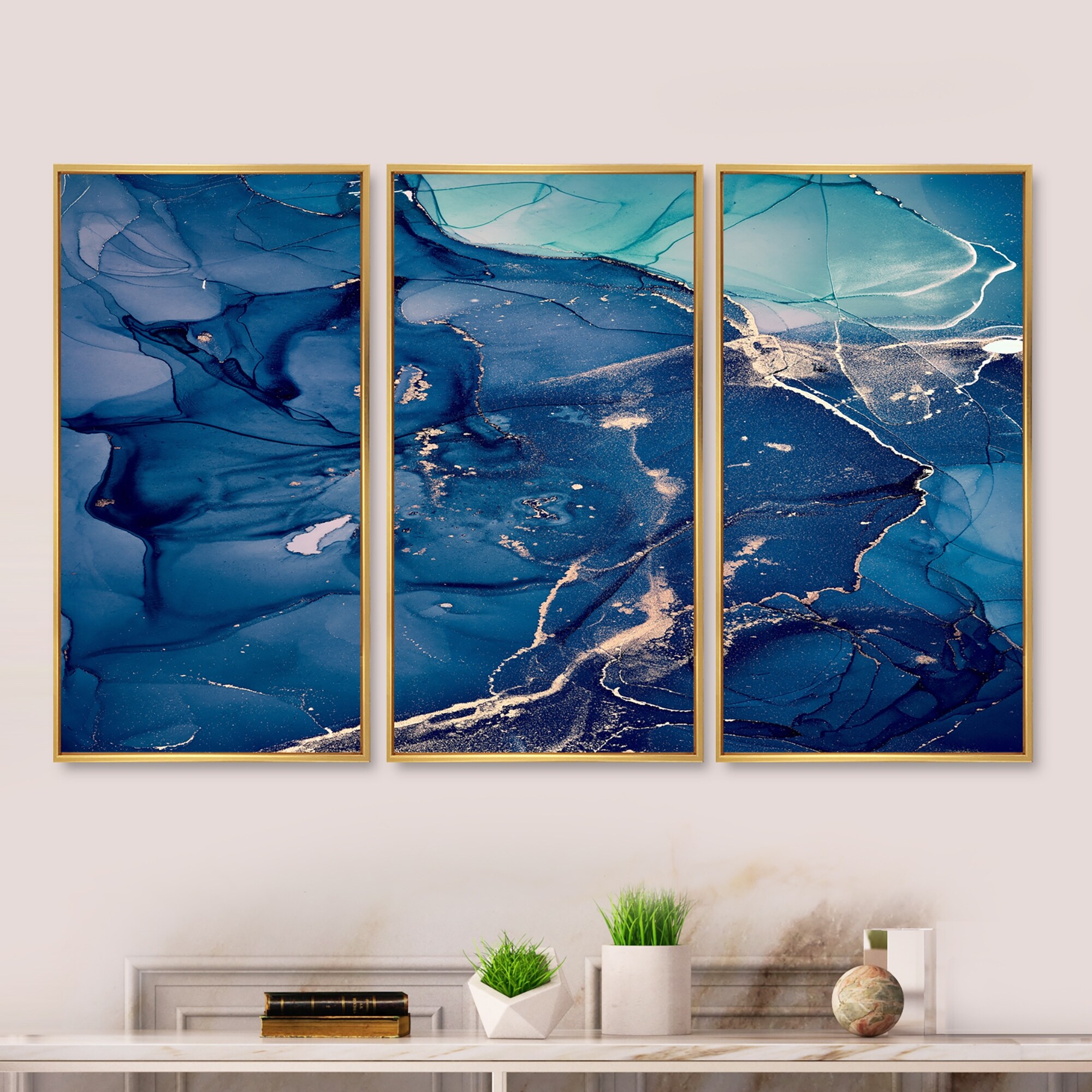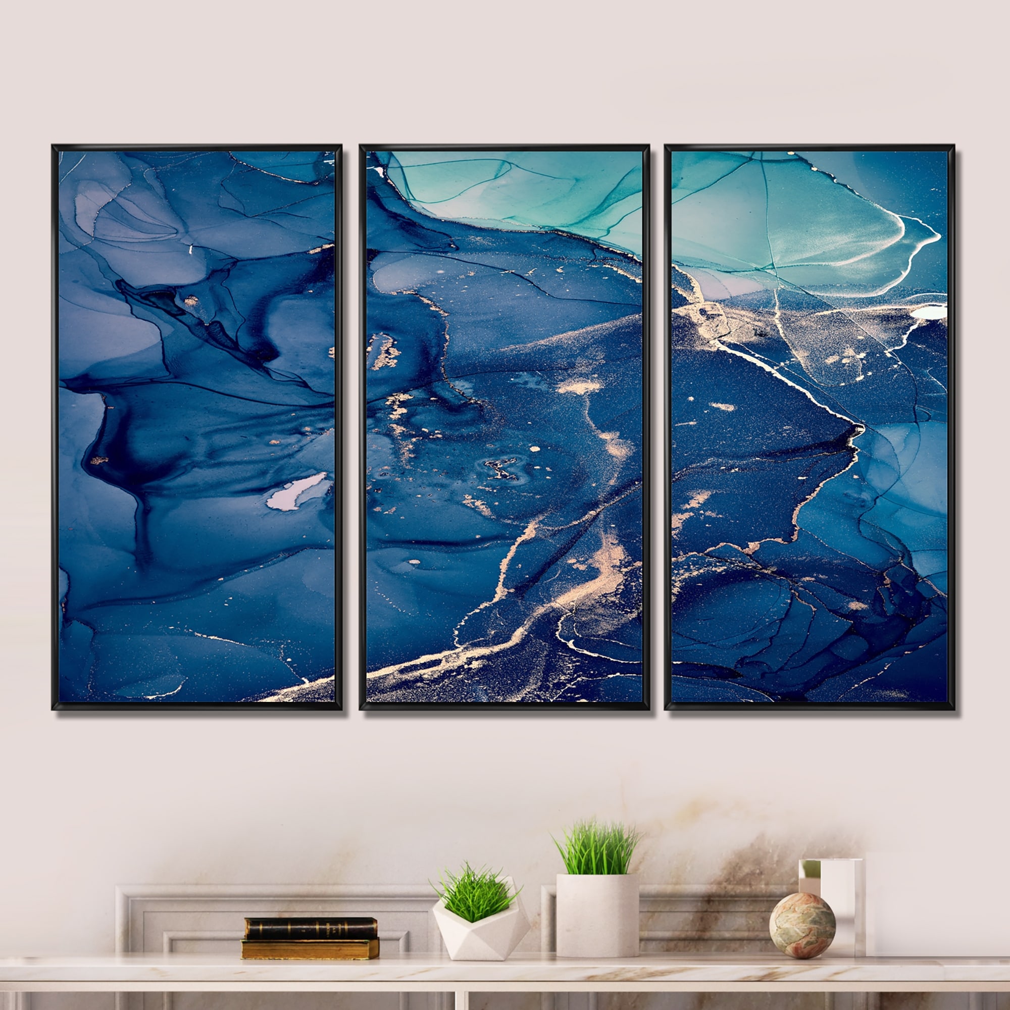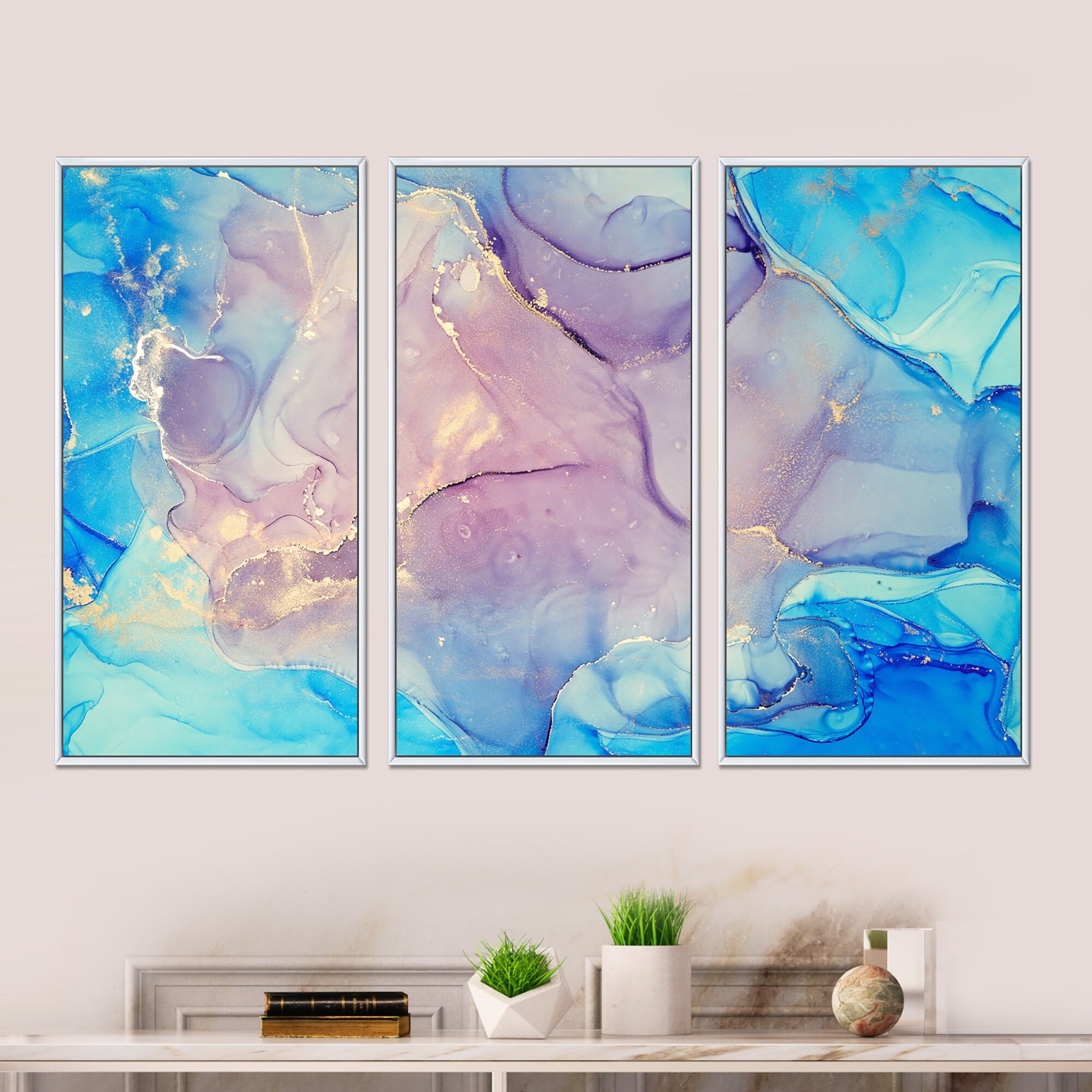 Designart "Blue And Pink Marble Ink Clouds II" Modern Framed Artwork Set of 3 - 4 Colors of Frames
