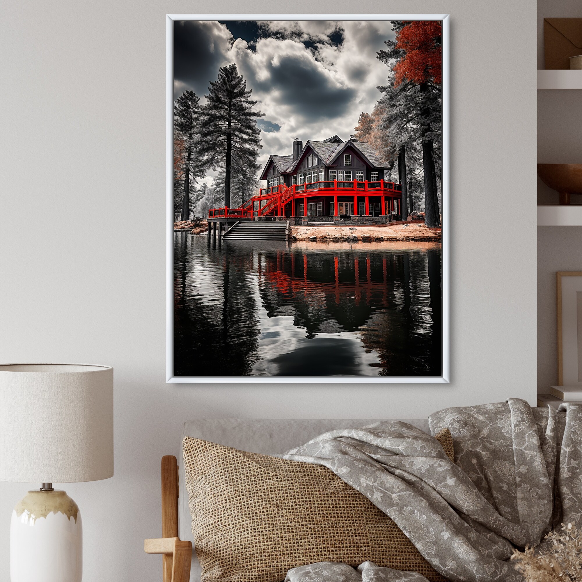 Designart "Red And Grey Lakeouse Majestic Retreat II" Lake House Cottage Framed Canvas Prints