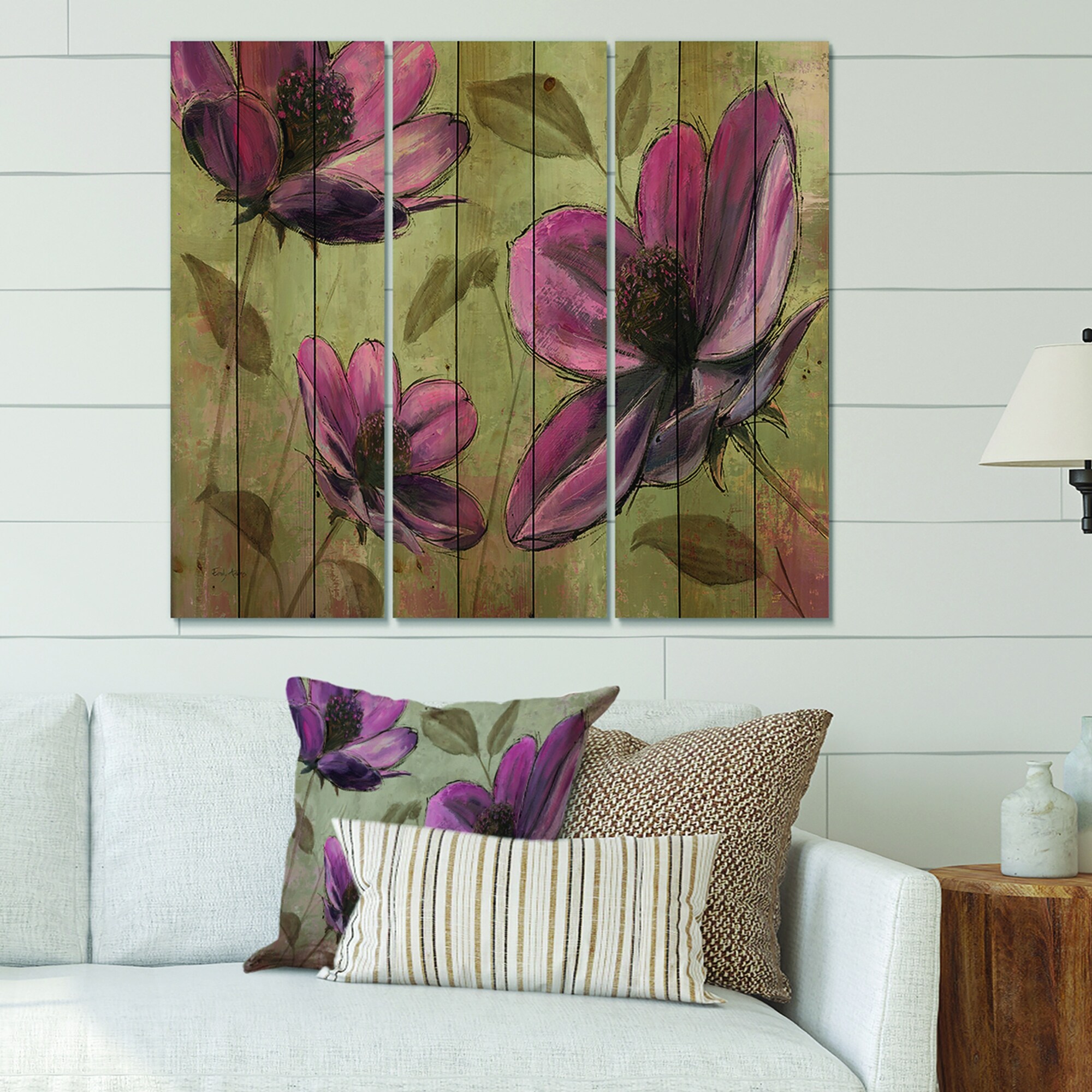 Designart 'Plum Pink Cottage Flowers' Traditional Print on Natural Pine Wood - 3 Panels