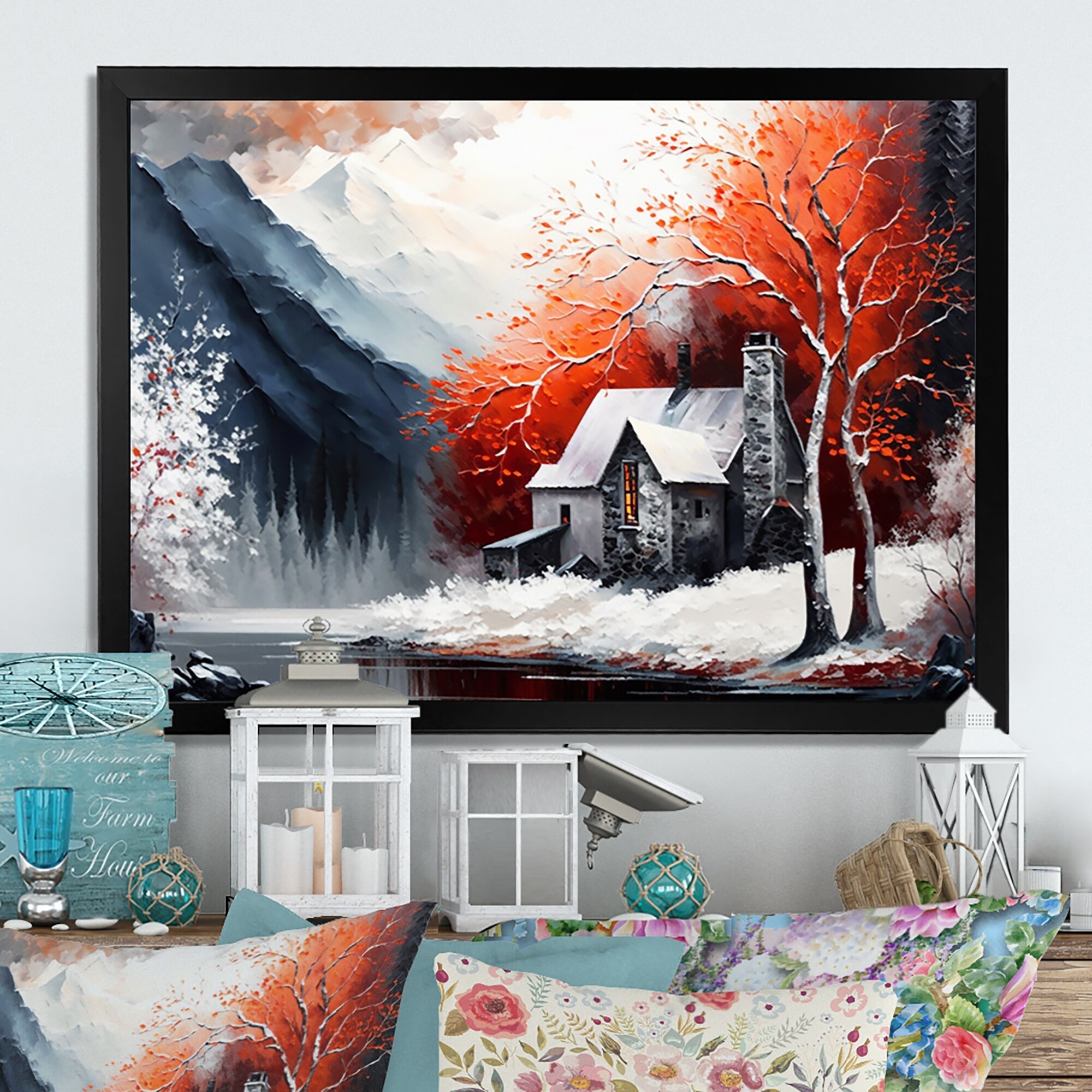 Designart "Monochrome Orange Cottage in Winter X" Landscape Framed Art Print