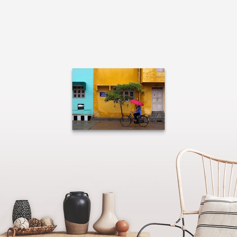 "Woman cycling in Pondicherry street with umbrella." Canvas Wall Art